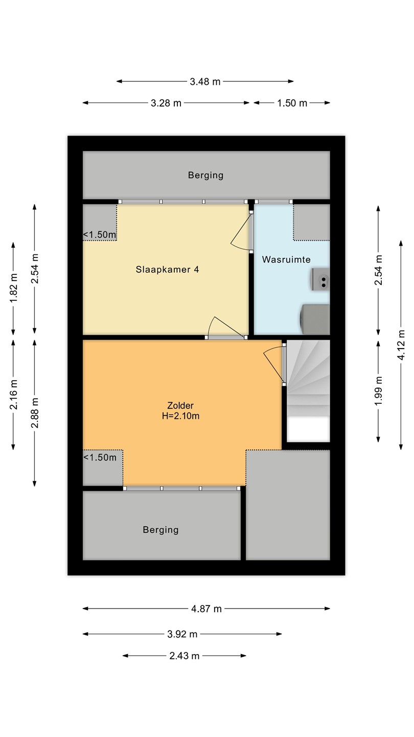 Hier heeft u de vierde slaapkamer en de wasruimte/berging. Via de overloop heeft u nog een open ruimte waar u eenvoudig nog een extra (slaap)kamer kunt creëren. In de wasruimte/berging heeft u de aansluiting van de wasmachine/droger.