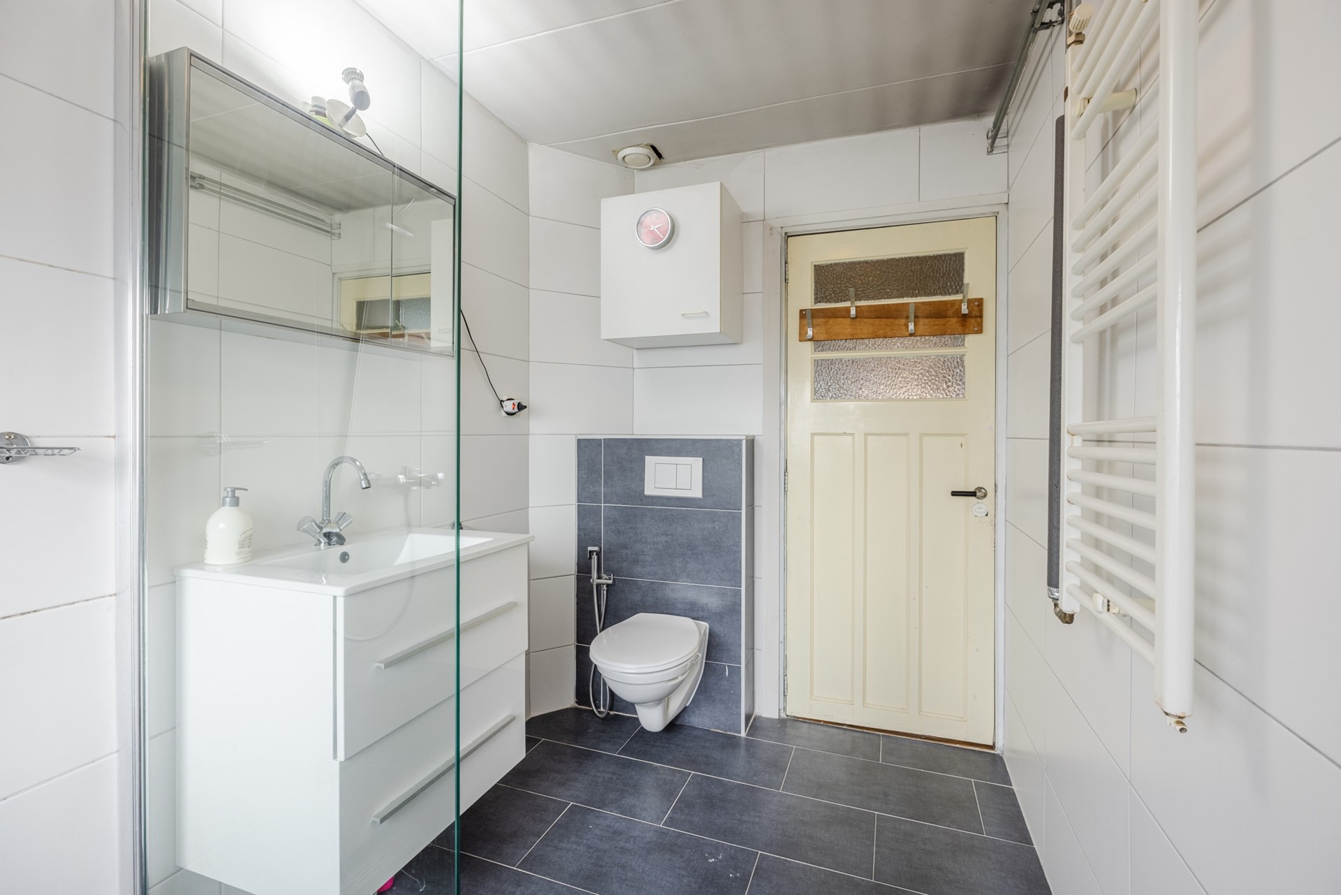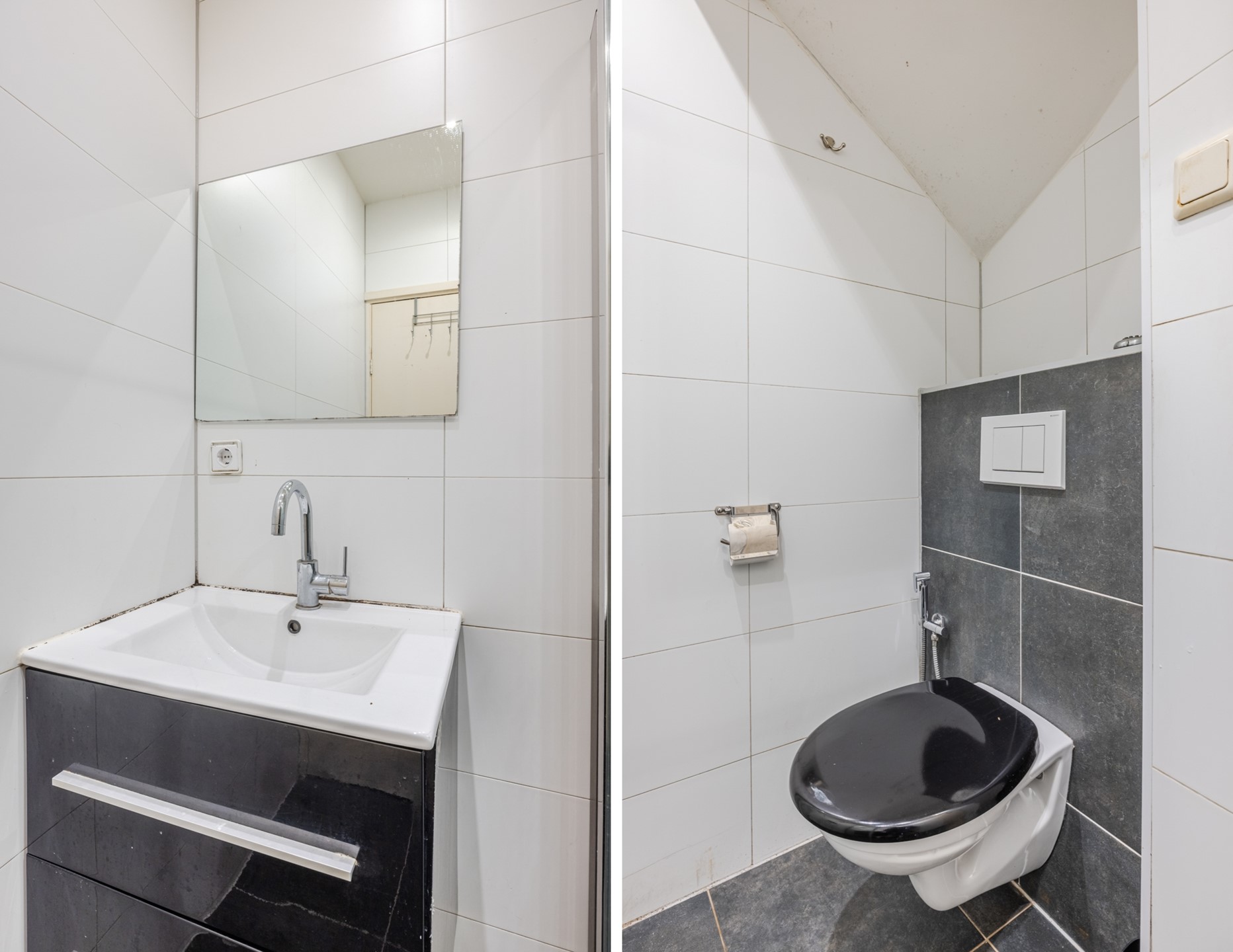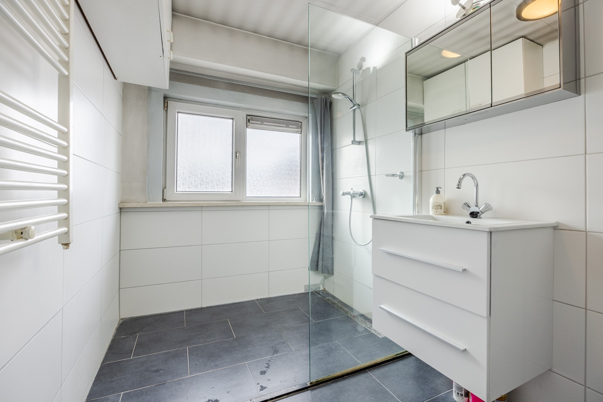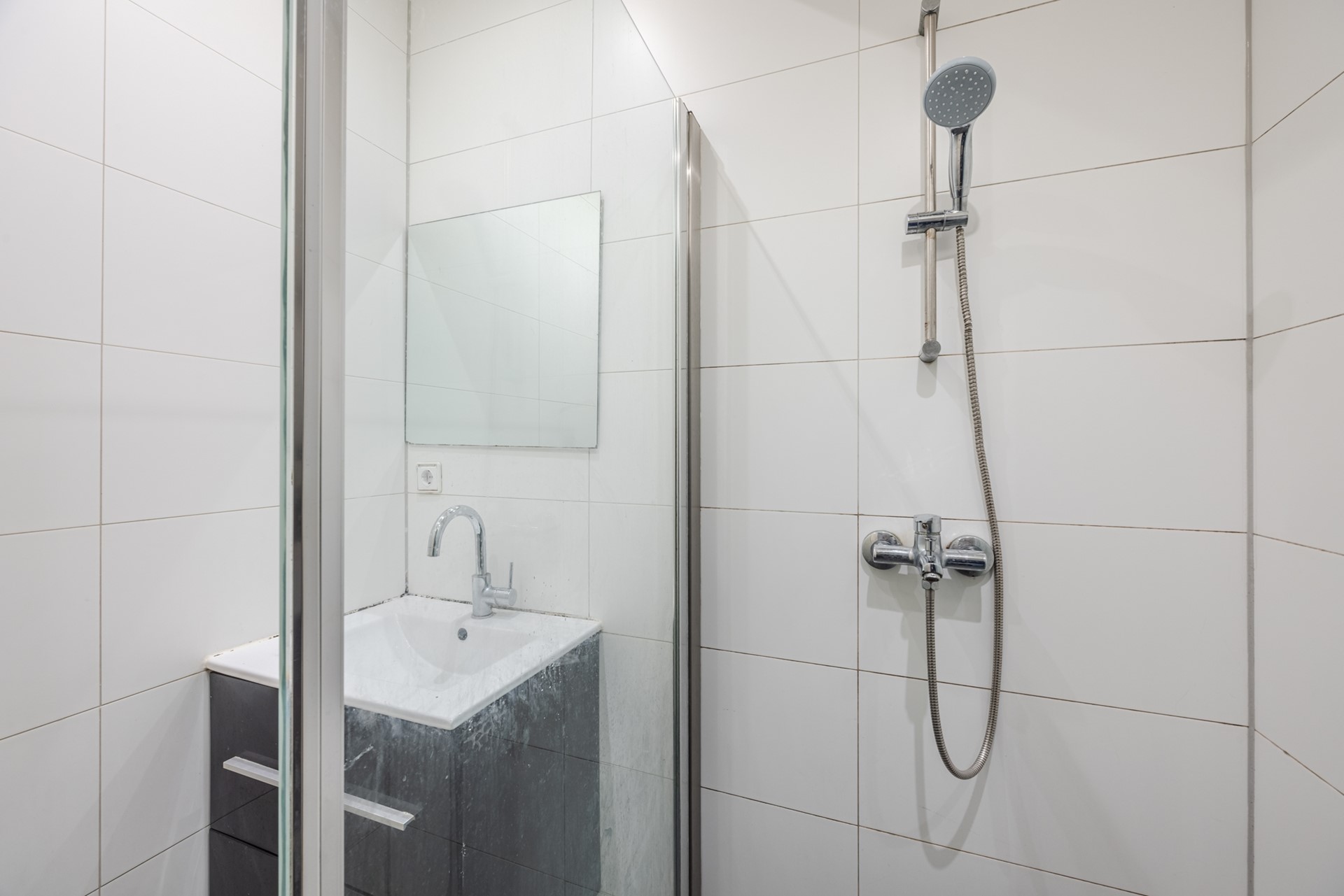 De badkamer (2018) is voorzien van een douche, wastafel en het toilet.