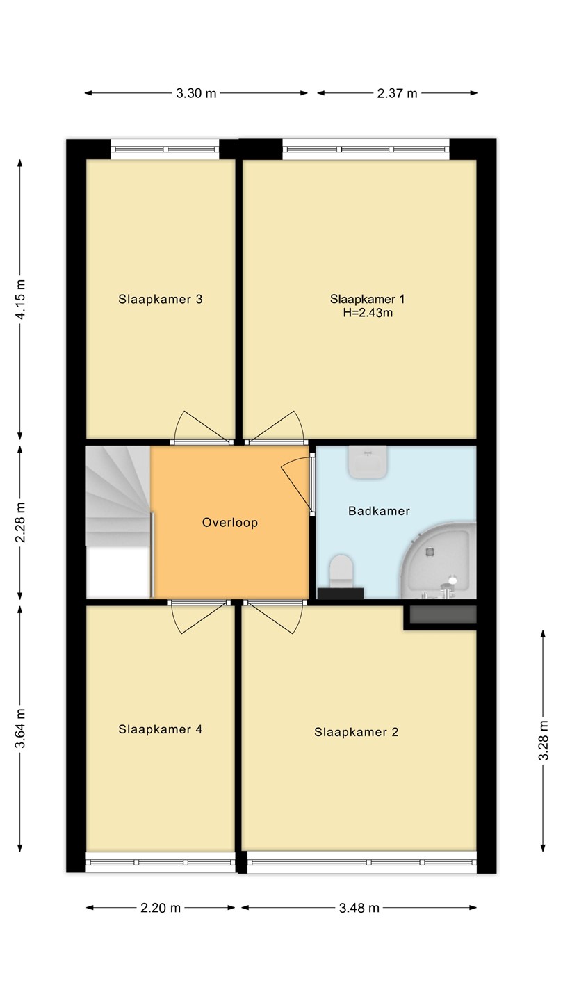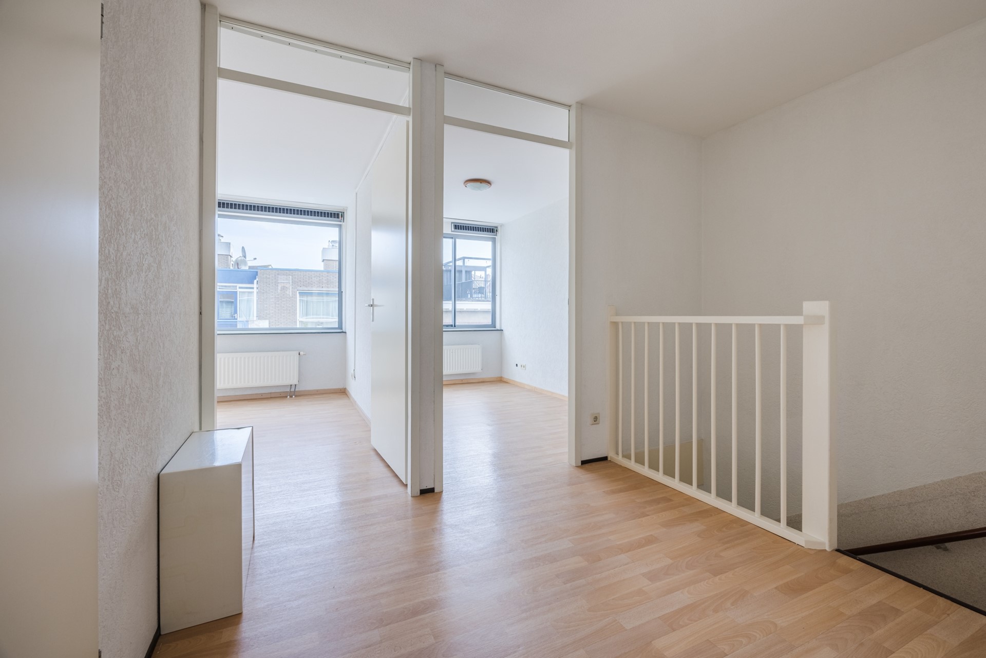Overloop met toegang tot vier goed bemeten slaapkamers en de badkamer.