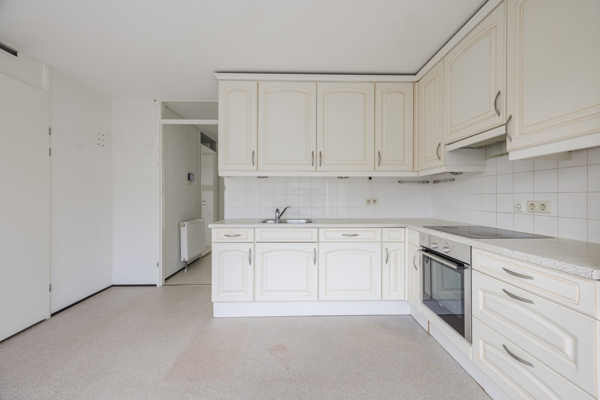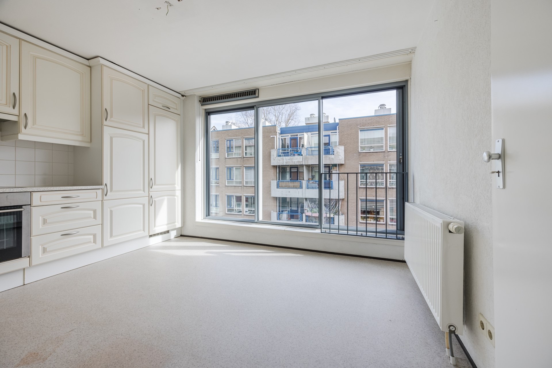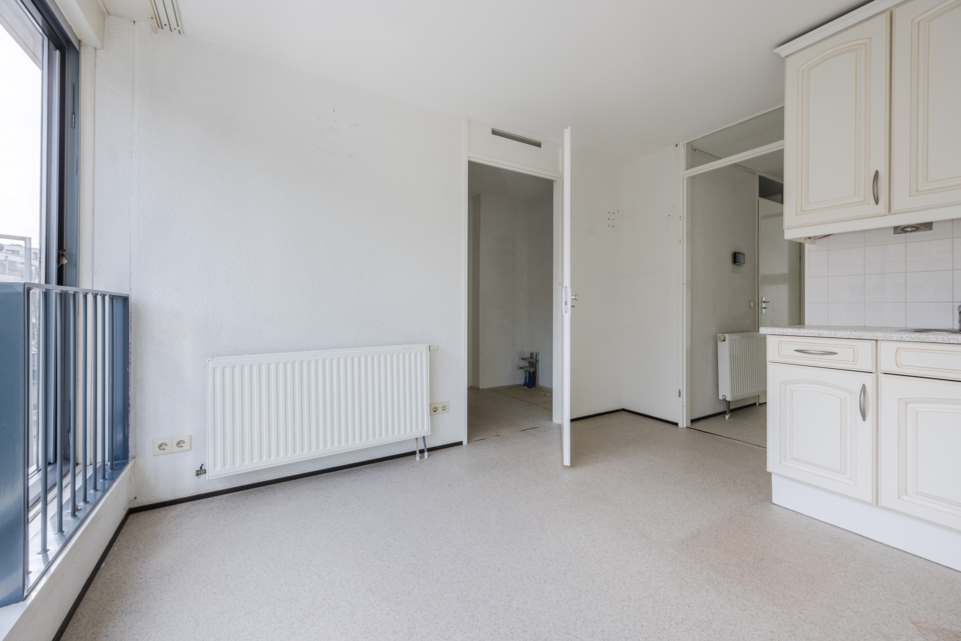 Overloop met toegang tot de lichte en ruime woonkamer van ca. 25 m². Via de schuifpui bereikt u het balkon van ca. 8 m², gelegen op het westen – ideaal om te genieten van de middag- en avondzon. Dankzij de grote raampartijen is er een prettige lichtinval.