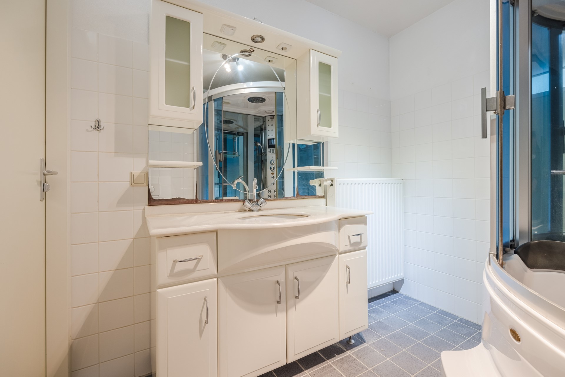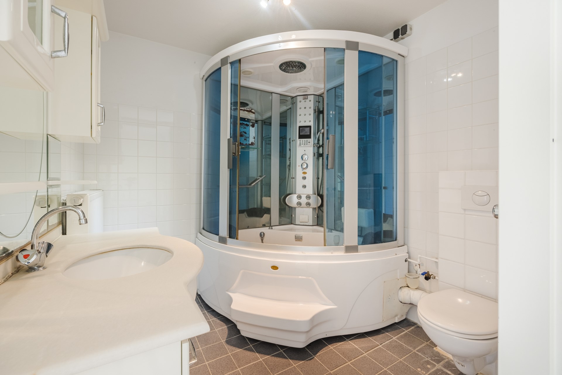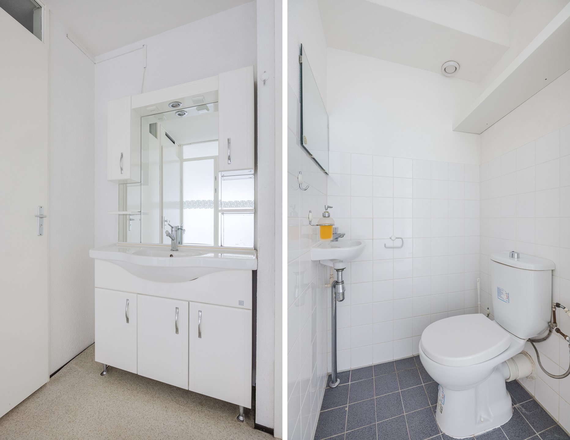 De badkamer is compleet uitgevoerd en beschikt over een douchecabine, een wastafelmeubel met spiegel en een tweede toilet.