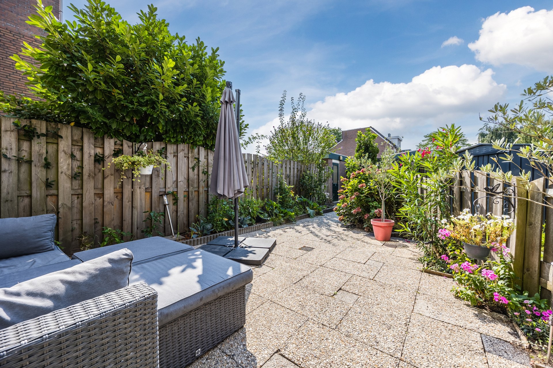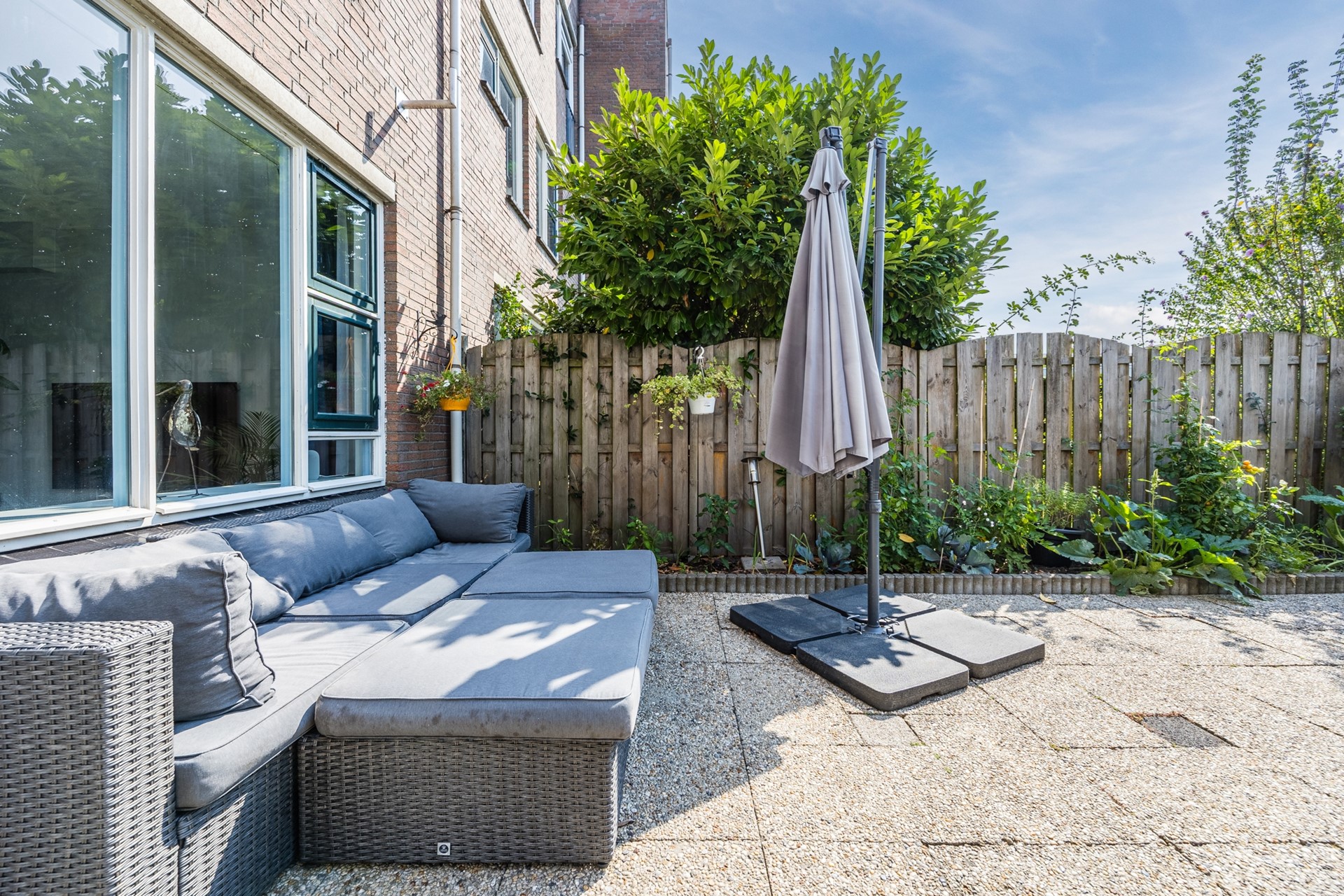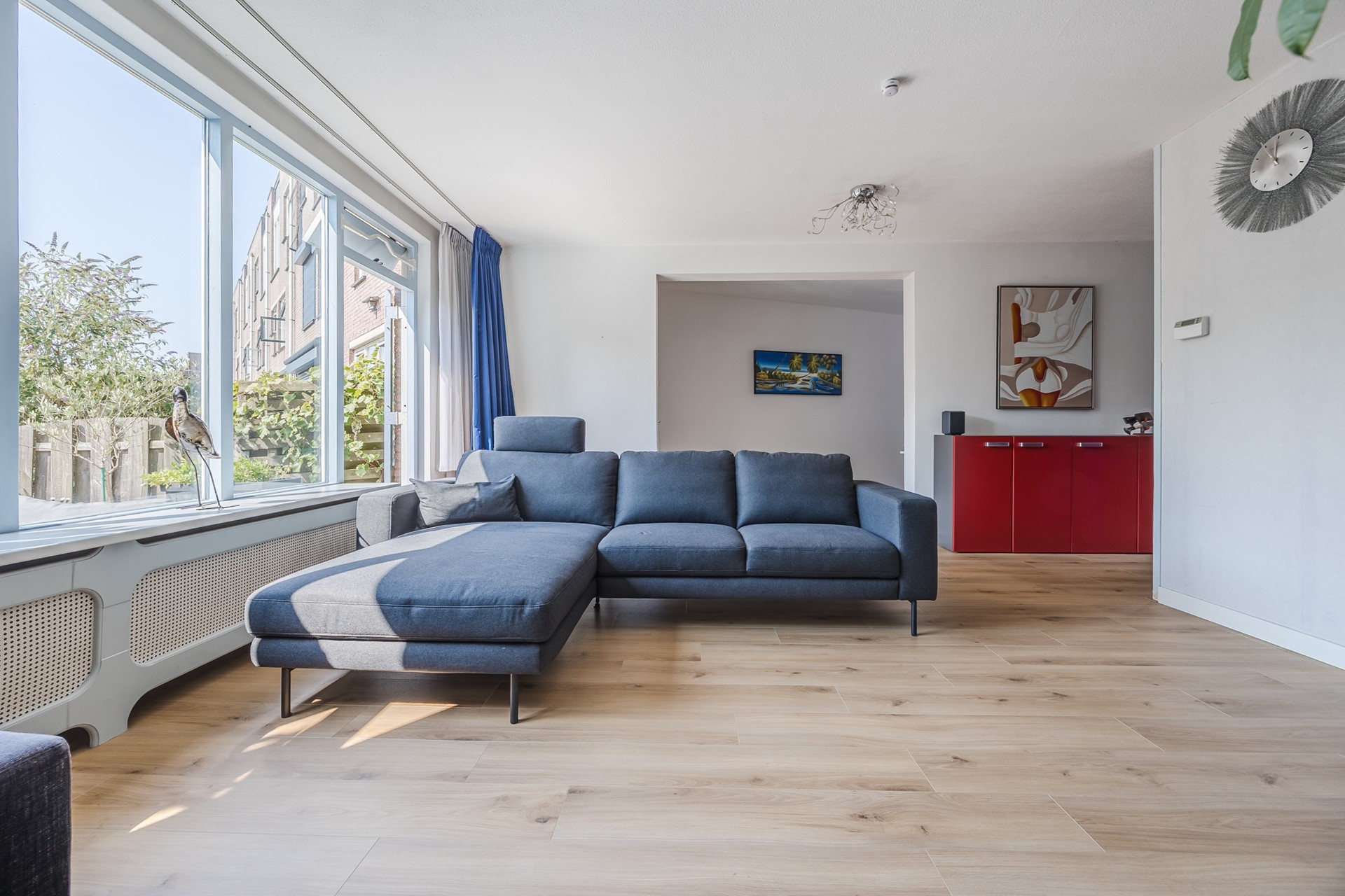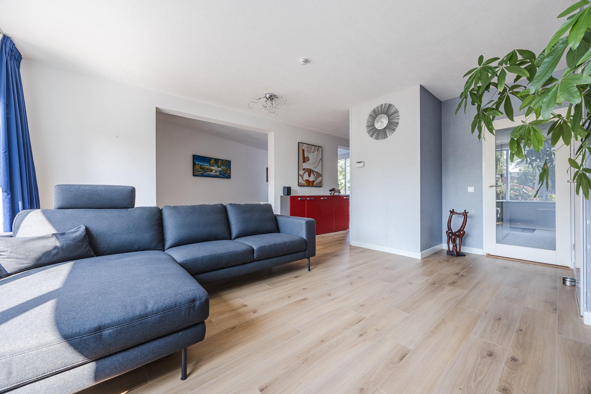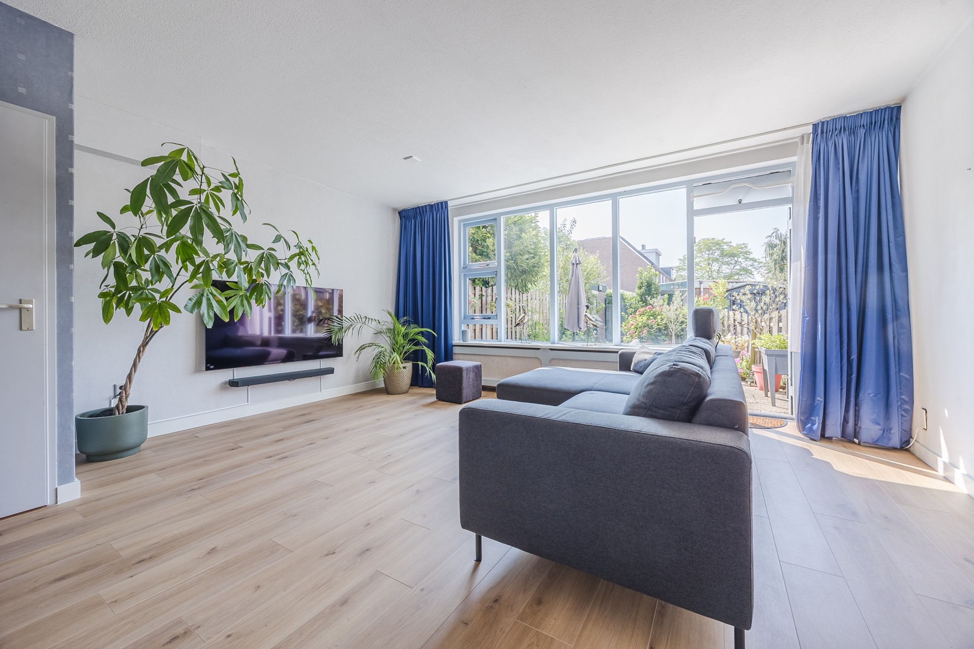 De woonkamer heeft door de grote ramen veel lichtinval. Doordat de woning in een hoek zit heeft u nog een extra gedeelte wat ook kan worden omgebouwd tot een extra kamer/werkruimte, nu is dit de eetkamer. Via de woonkamer heeft u toegang tot de achtertuin (ca. 31 m2). De achtertuin is gelegen op het zuidwesten en is ook bereikbaar via een achterom.