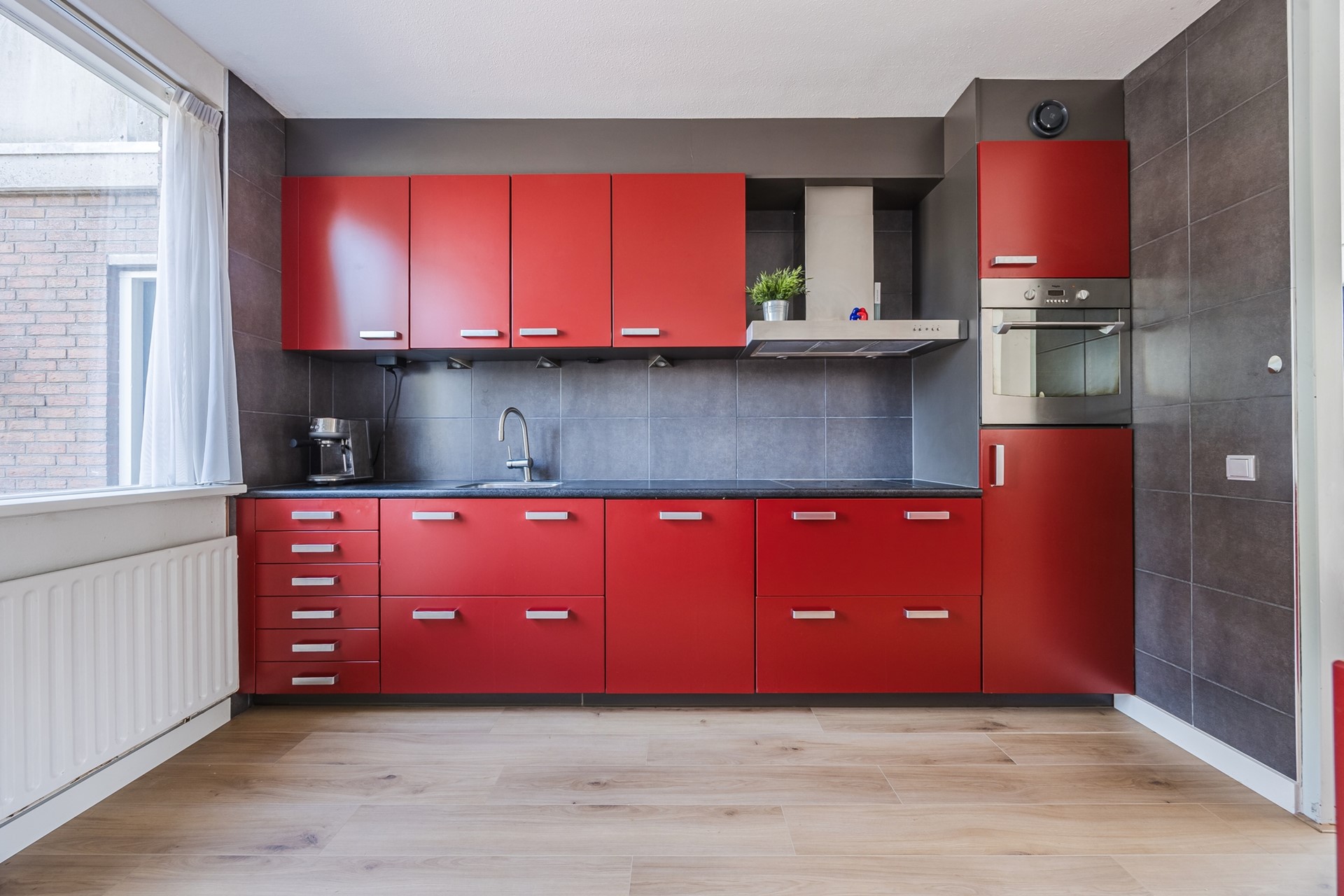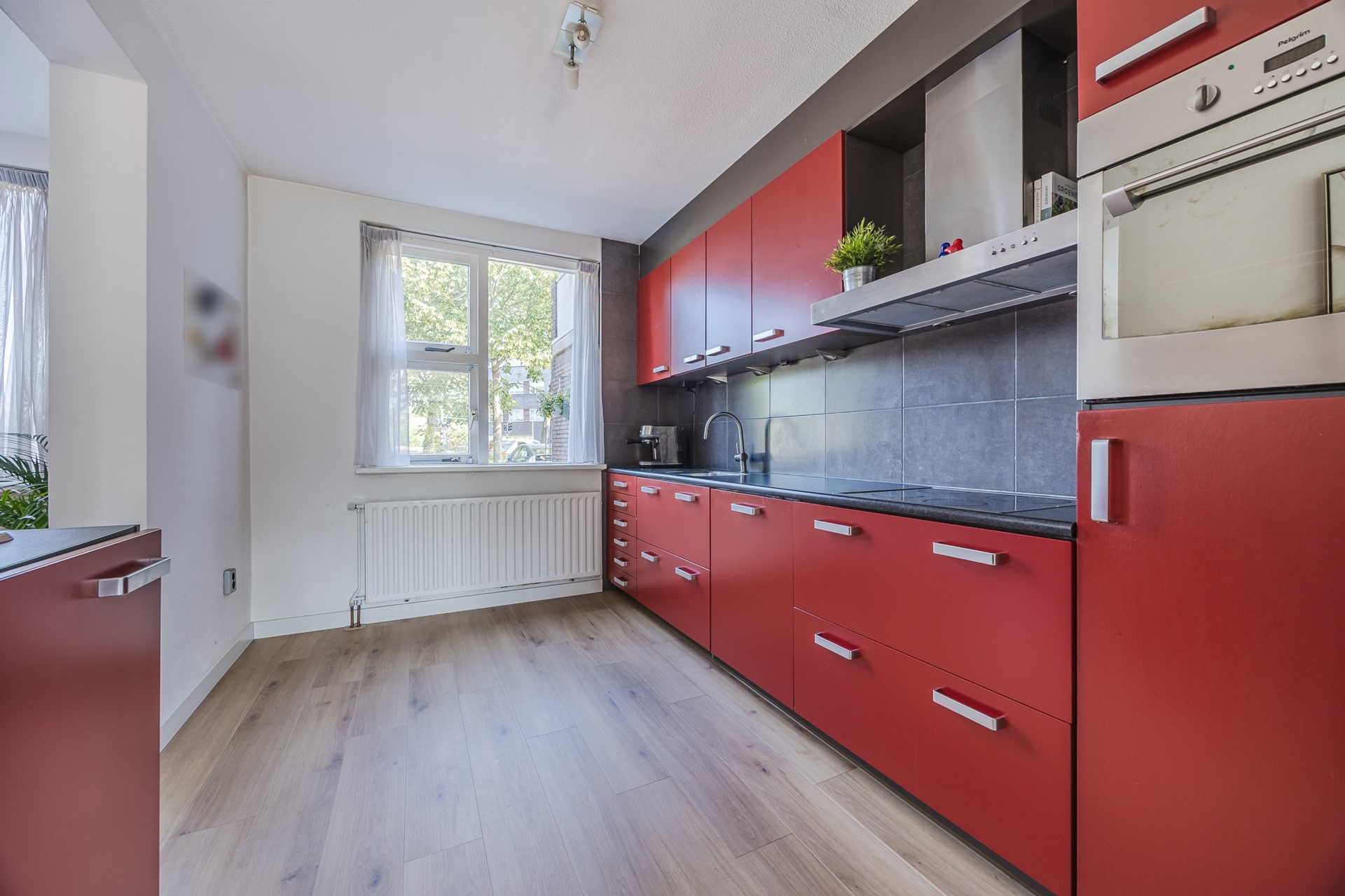 De open keuken is gelegen aan de voorzijde van de woning en is voorzien van een 4-pits elektrische kookplaat, afzuigkap, oven, koelkast, vaatwasser, spoelbak en voldoende kast- en werkruimte.