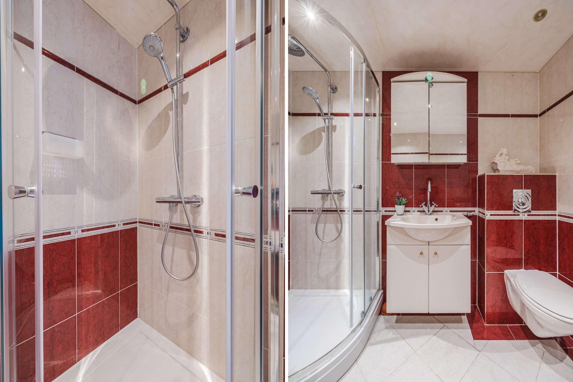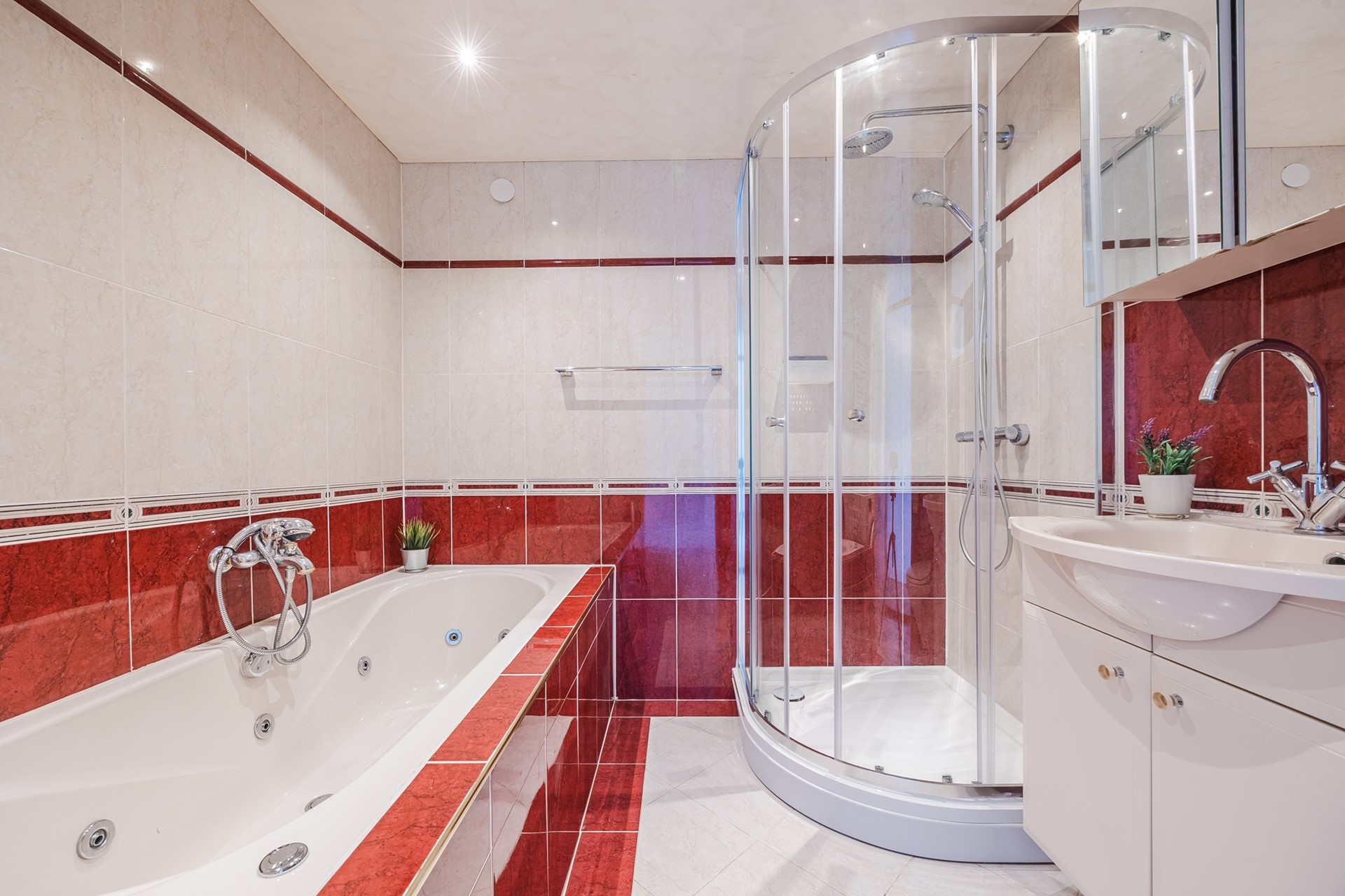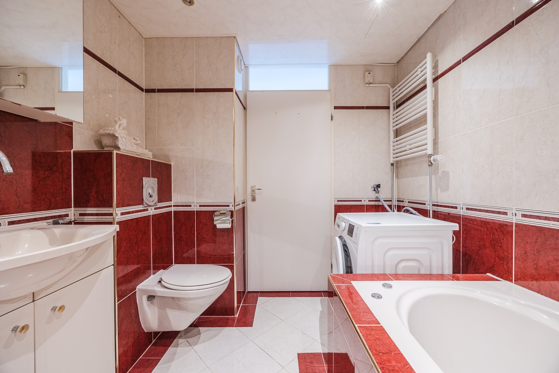 De badkamer is geheel betegeld en voorzien van een bubbelbad, douche, hangend toilet, een wastafel met onderkast en spiegel.