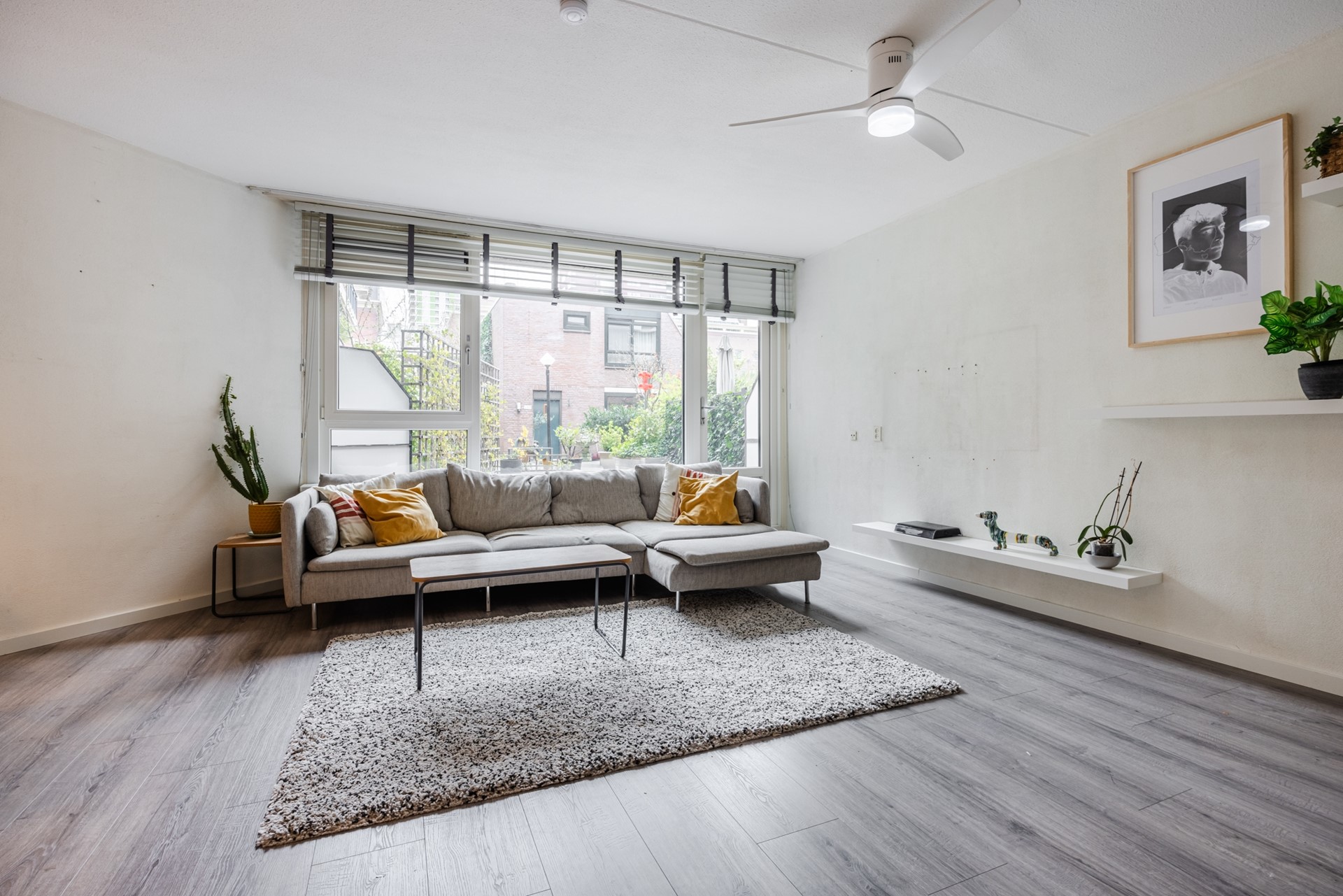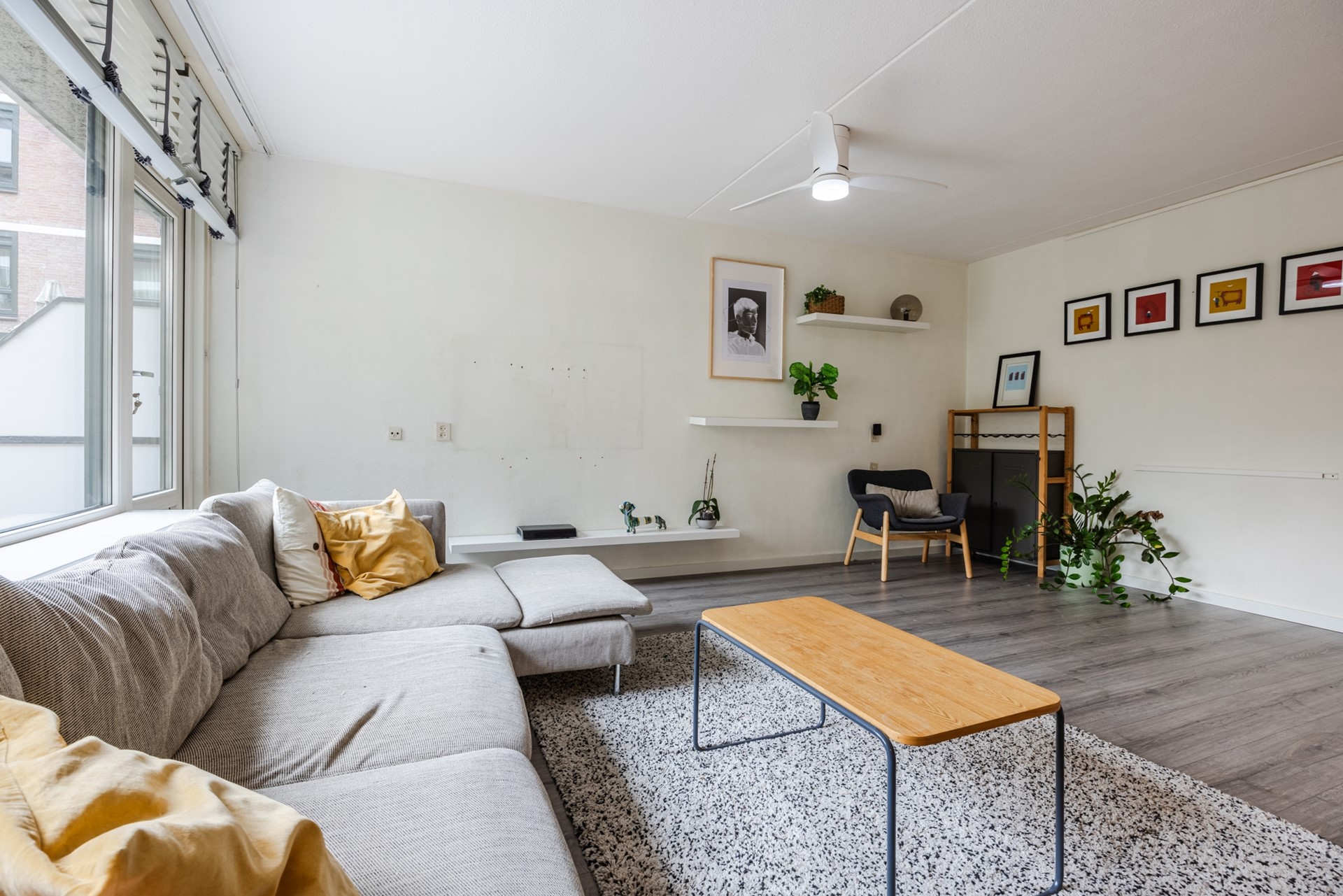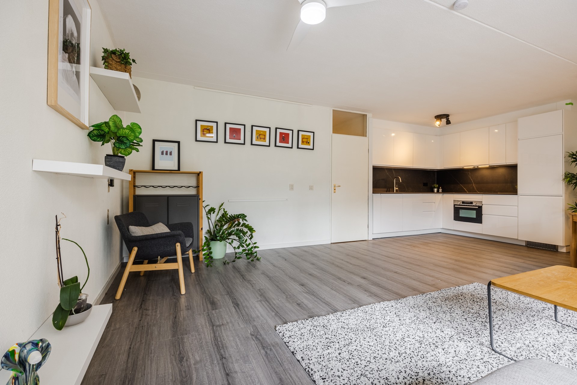 De ruime en lichte woonkamer (ca. 25 m²) is praktisch ingedeeld met een comfortabel zit- en eetgedeelte. De woonkamer bevindt zich aan de achterzijde van het appartement en is voorzien van een nette laminaatvloer en strak gestuukte wanden. Vanuit de woonkamer heeft u direct toegang tot het zonnige terras (ca. 11 m²), gelegen op het zuiden – een heerlijke plek om van de zon te genieten.