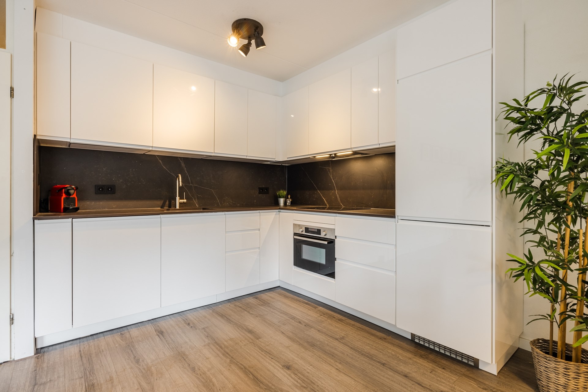 De moderne open keuken (2025) is van alle gemakken voorzien en beschikt over een vaatwasser, 4-pits inductie kookplaat, afzuigkap, combi-oven, koel-/vriescombinatie, spoelbak en voldoende opberg- en kastruimte.