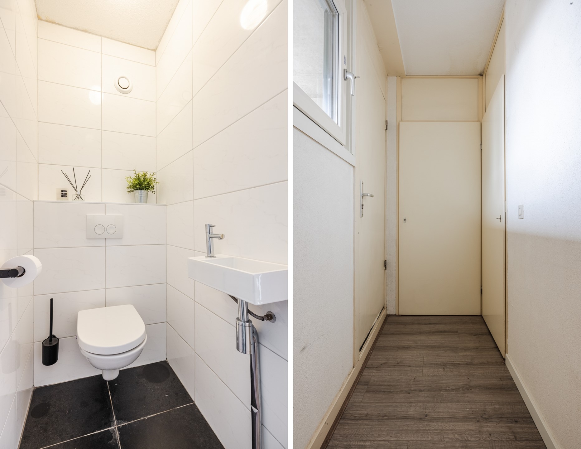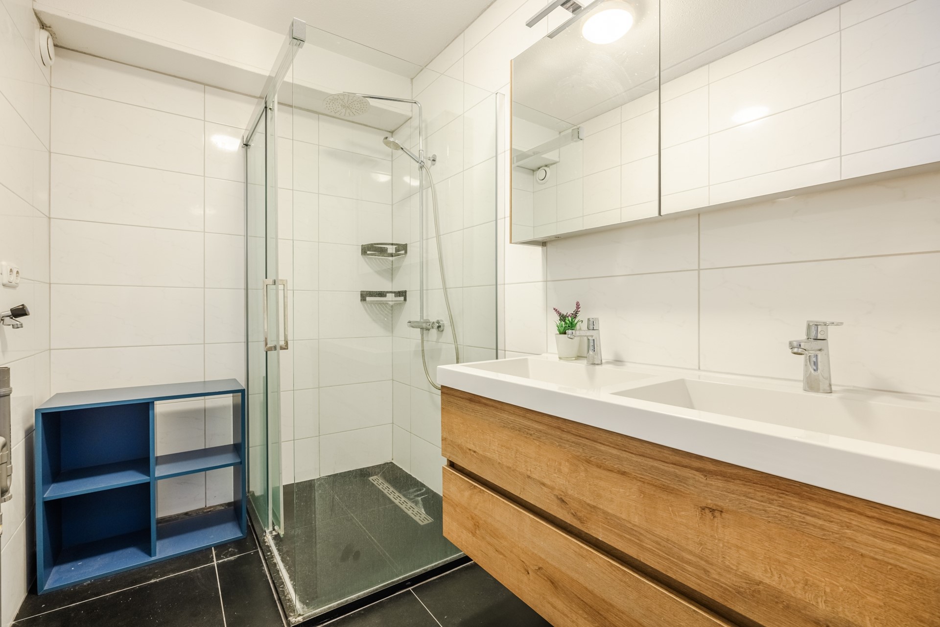 De ruime badkamer is compleet uitgevoerd met een inloopdouche, dubbele wastafel met spiegel, designradiator en aansluitingen voor zowel wasmachine als droger. Daarnaast beschikt het appartement over een separate, volledig betegelde toiletruimte met hangend toilet en fonteintje, een meterkast en een praktische voorraadkast.