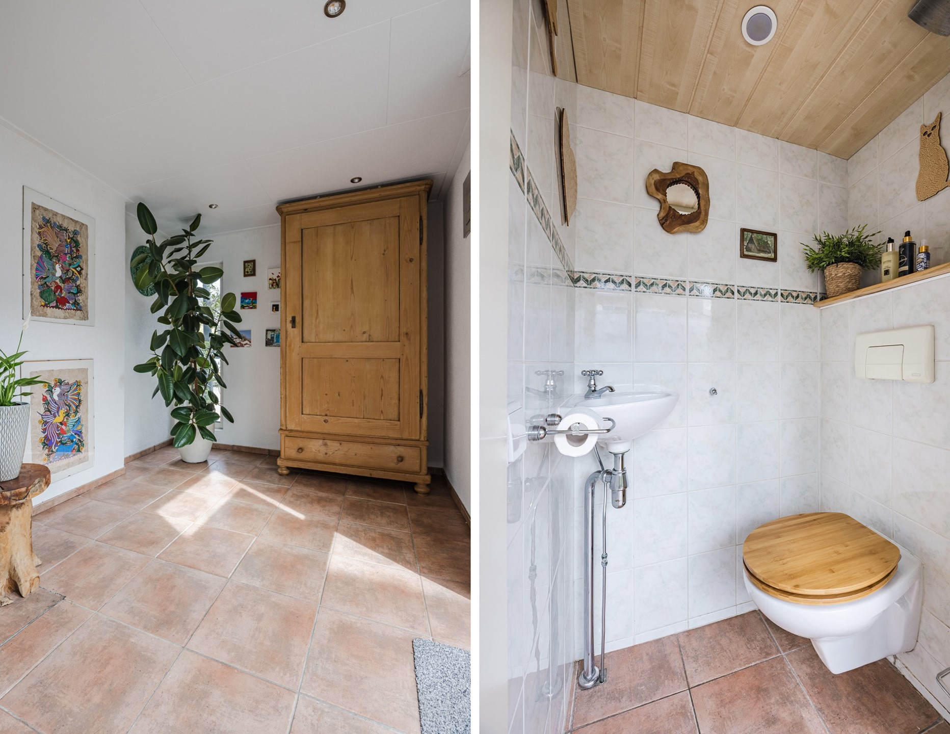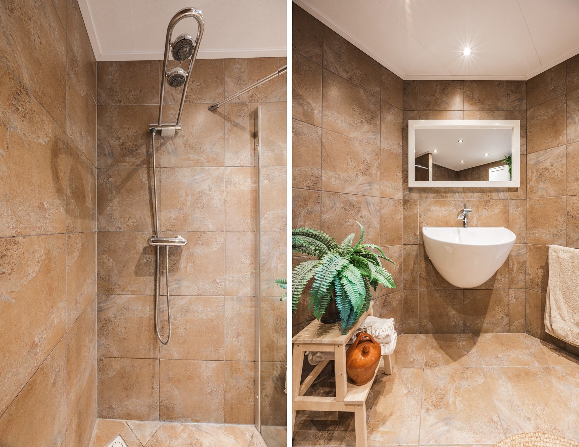 De vergrote badkamer (ca. 7 m²) is volledig betegeld en uitgerust met een inloopdouche, zwevend toilet, wastafel met onderkast en spiegel, en een praktische opbergkast.