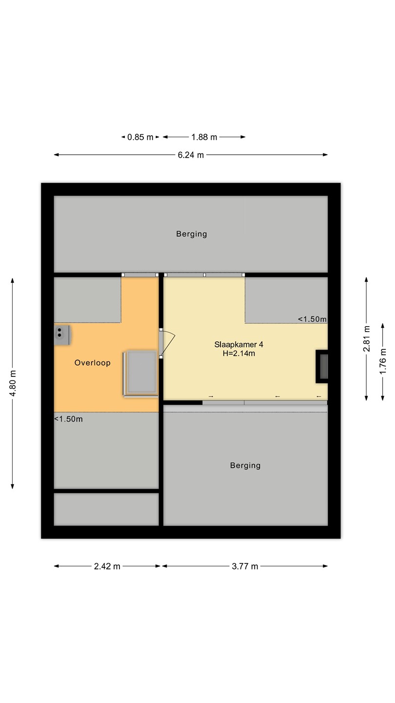 Via een uitschuifbare zoldertrap bereikt u de tweede verdieping. Deze ruimte biedt de mogelijkheid tot het realiseren van een vaste trap en het creëren van een volwaardige vierde slaapkamer of extra bergruimte.