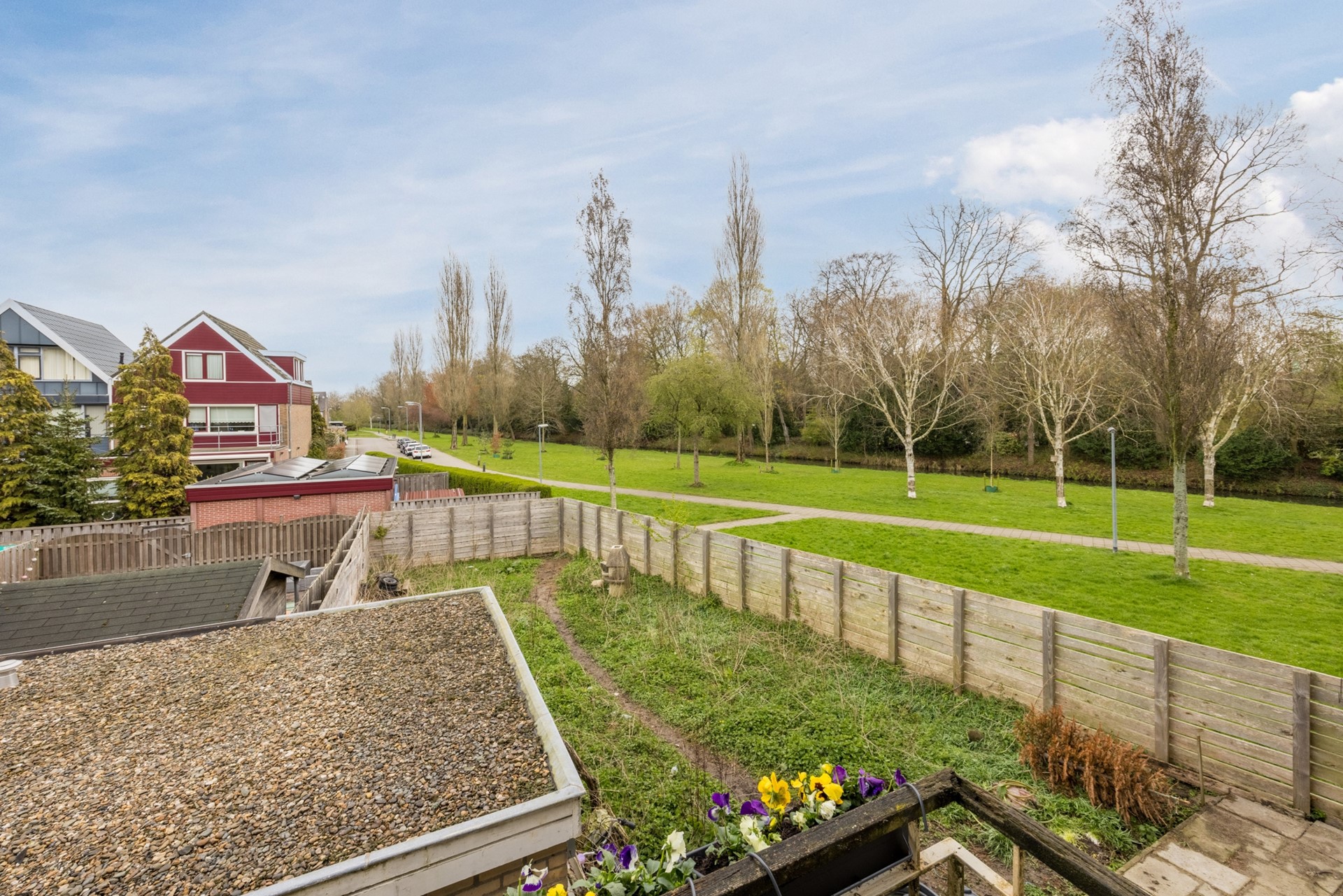 Via de openslaande deuren bereikt u de ruime achtertuin (ca. 120 m²), gelegen op het noordoosten, waar u heerlijk kunt genieten van de buitenruimte.