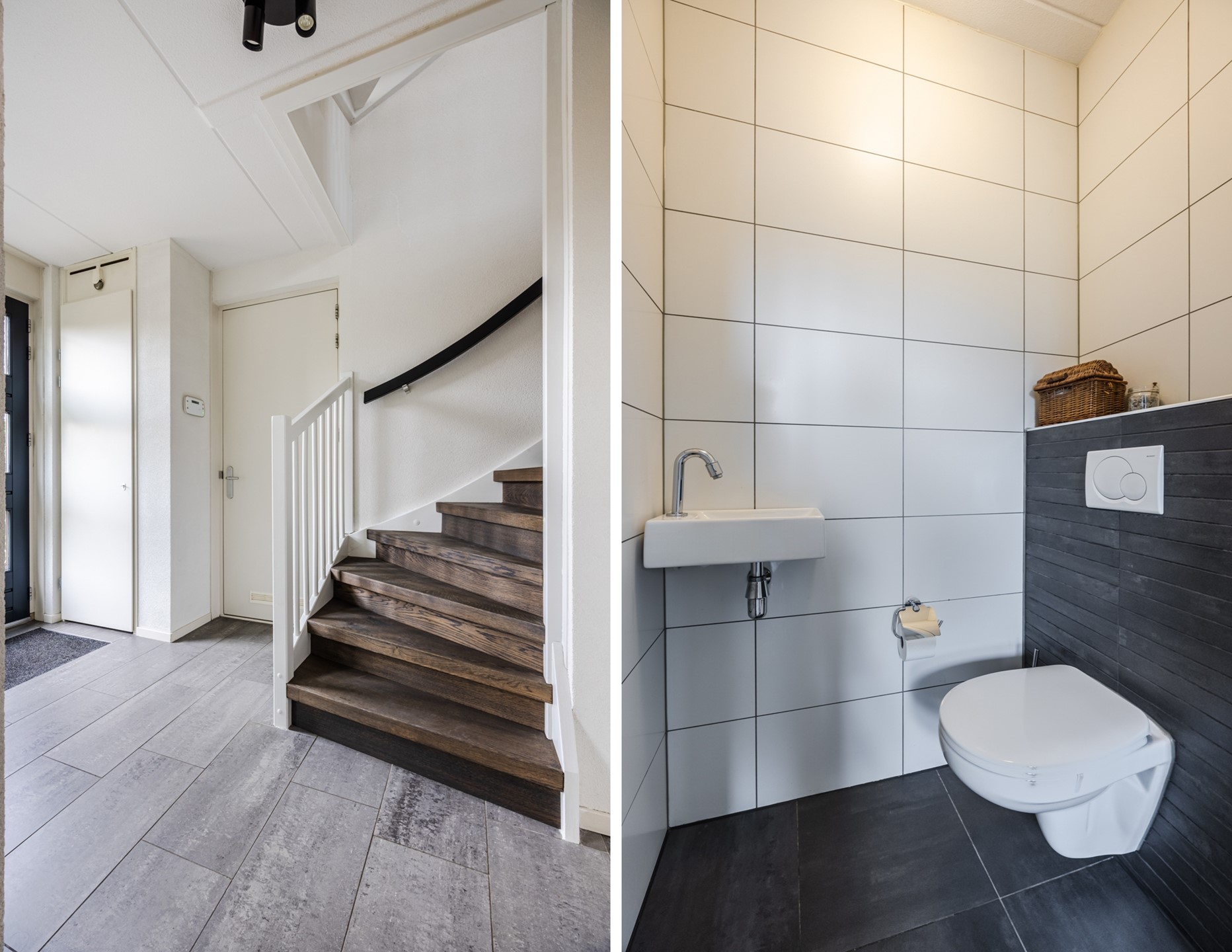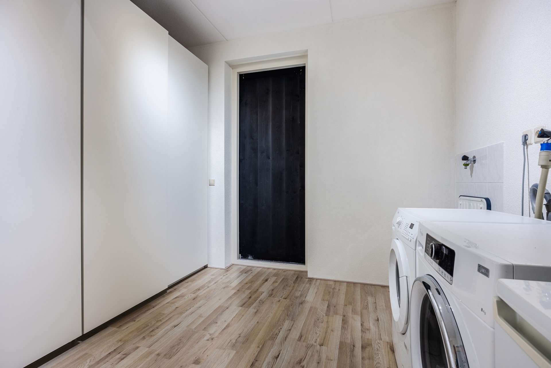 Verder is er op de begane grond een bijkeuken, een trapkast voor extra opbergruimte en de garage. De bijkeuken (ca.10 m2) is vanuit de eetkamer te bereiken via een houten loftdeur. In de bijkeuken is een grote kast met schuifdeuren aanwezig die garant staat voor voldoende bergruimte. Hier bevindt zich tevens een fontijntje en aansluitingen voor wasmachine en droger. Hier is ook plaats voor een tweede koel-vries-combinatie. Vanuit de bijkeuken stapt u in de ruime garage via een brandwerende deur. De garage is geisoleerd en voorzien van een elektrische garagedeur.