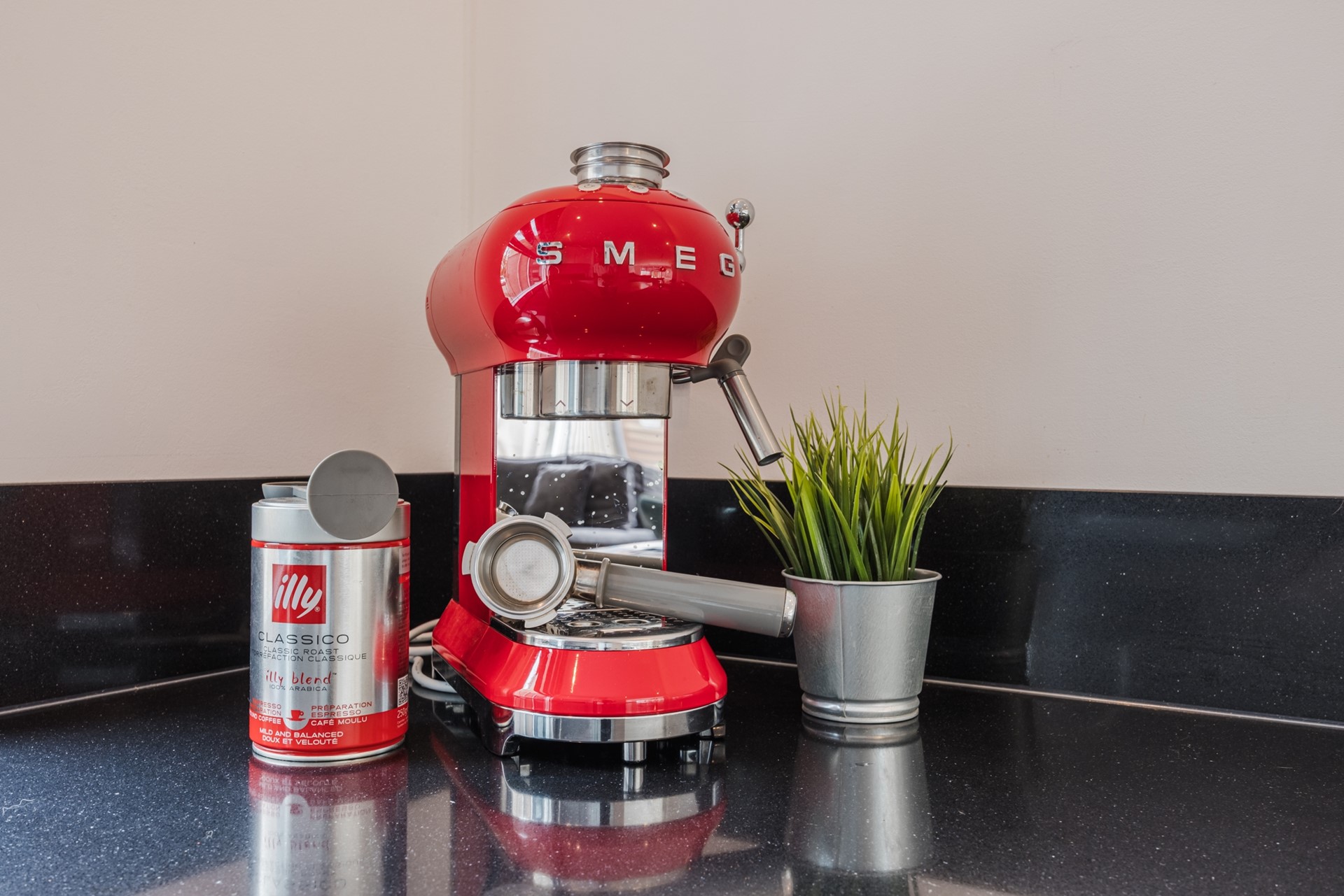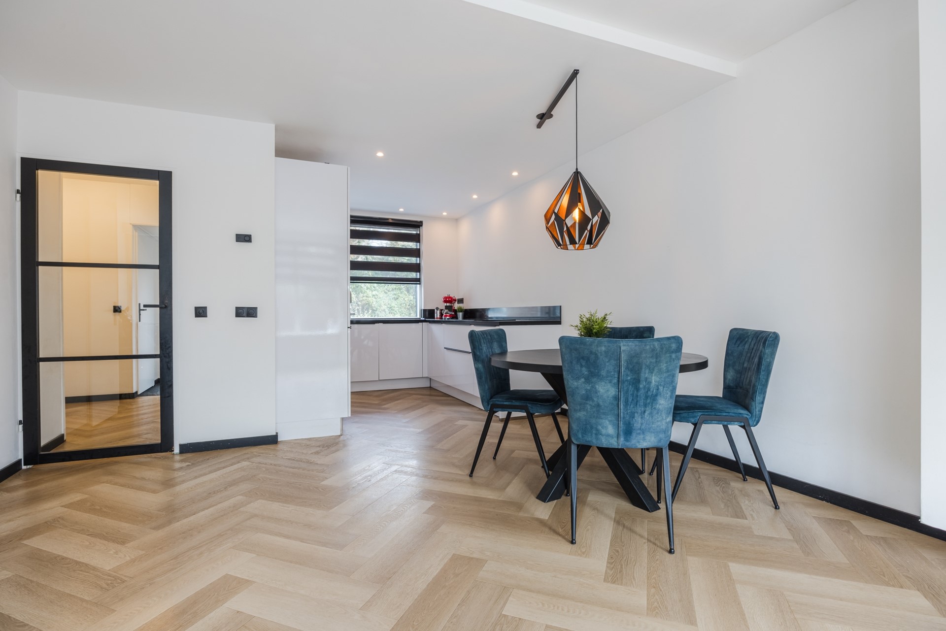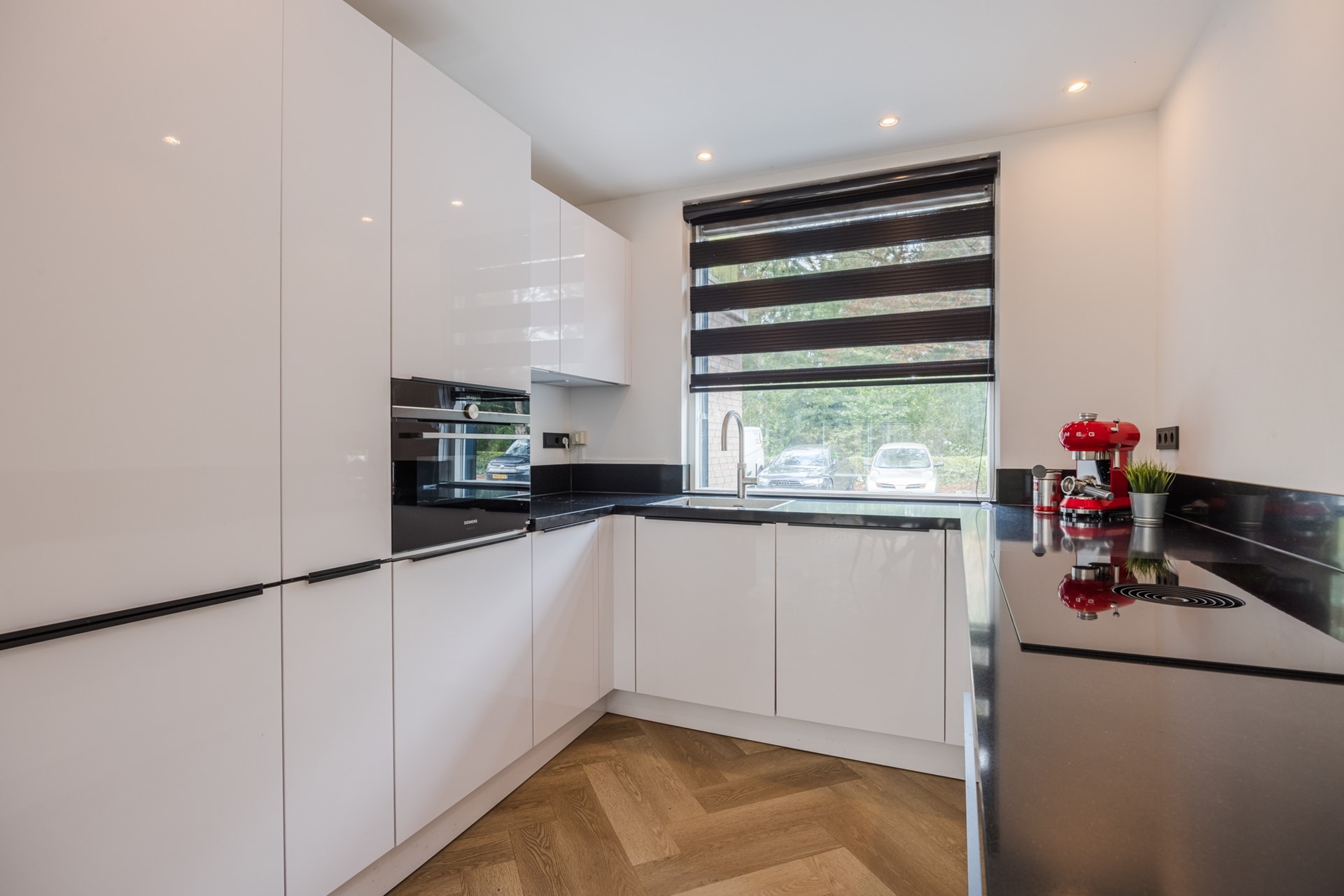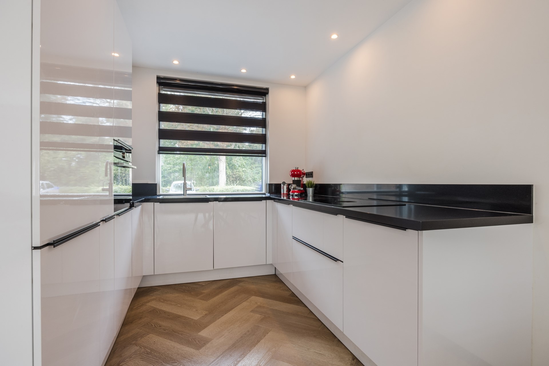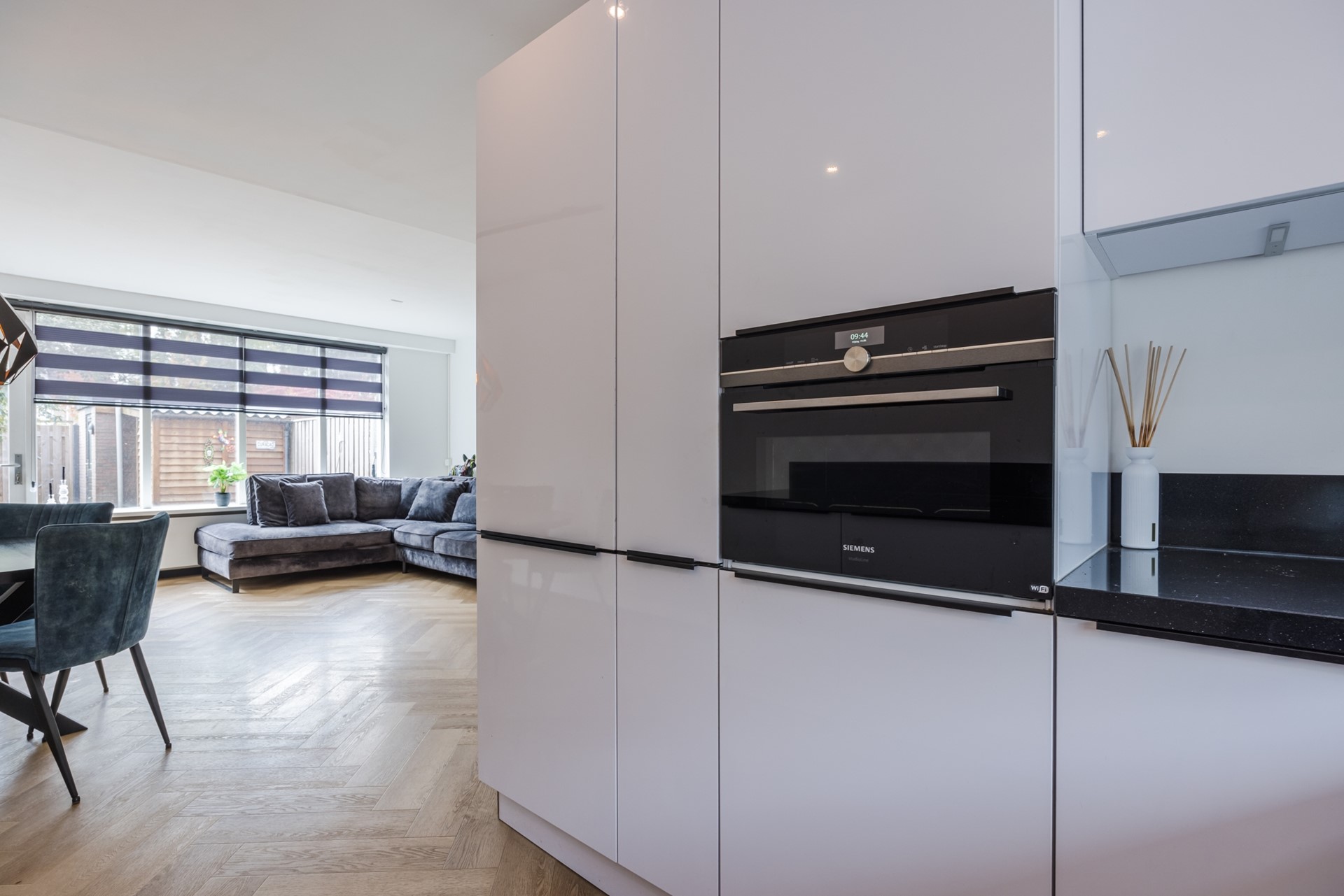 De keuken is gelegen aan de voorzijde van de woning en is voorzien van een 4-pits inductie kookplaat, combi-oven, koelkast, vriezer, vaatwasser, afzuigkap, spoelbak en voldoende kast- en werkruimte.