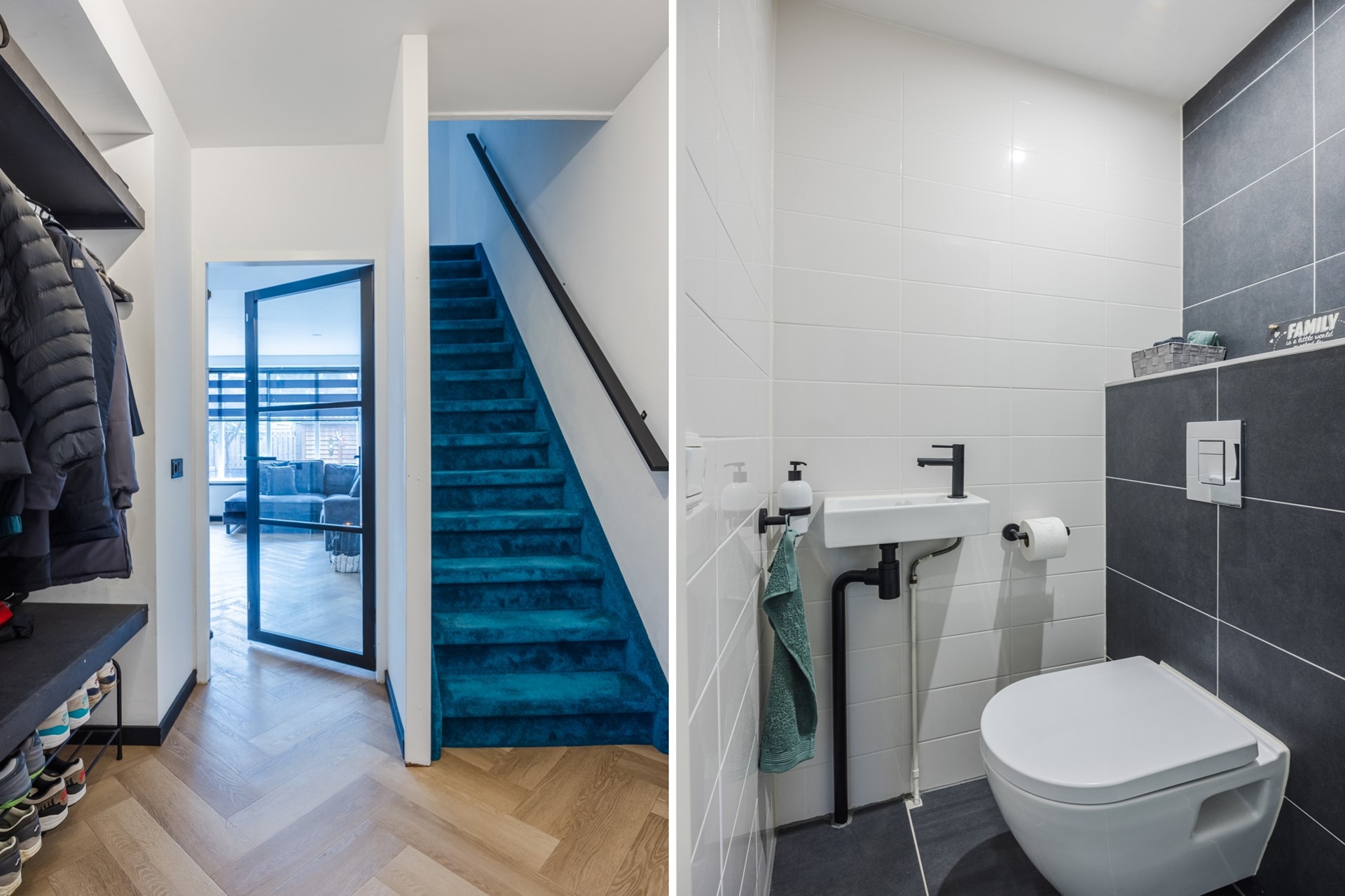 Verder heeft u hier nog het toilet, de meterkast en de trapkast. Het toilet is gedeeltelijke betegeld en voorzien van een hangend closet en een fonteintje.