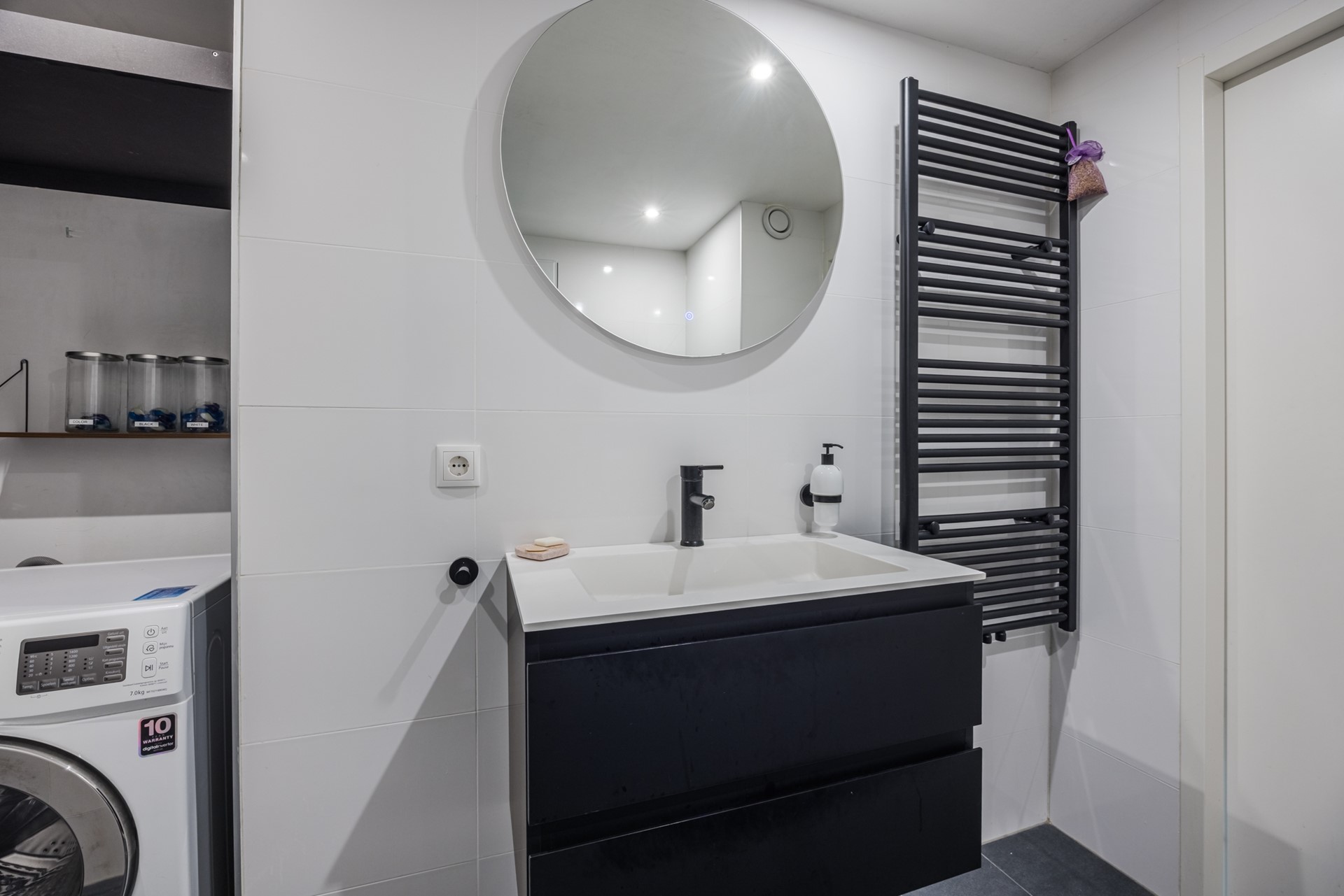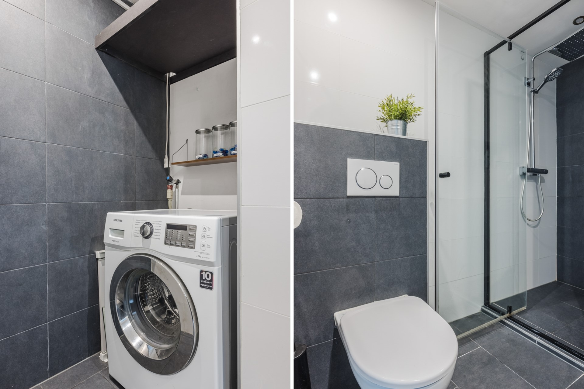 De badkamer is geheel betegeld en voorzien van een douche, hangend toilet, een wastafel met onderkast en spiegel. In de badkamer heeft u de aansluiting voor de wasmachine.