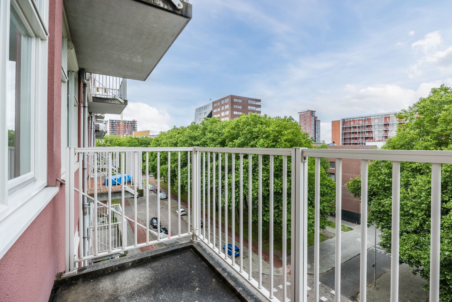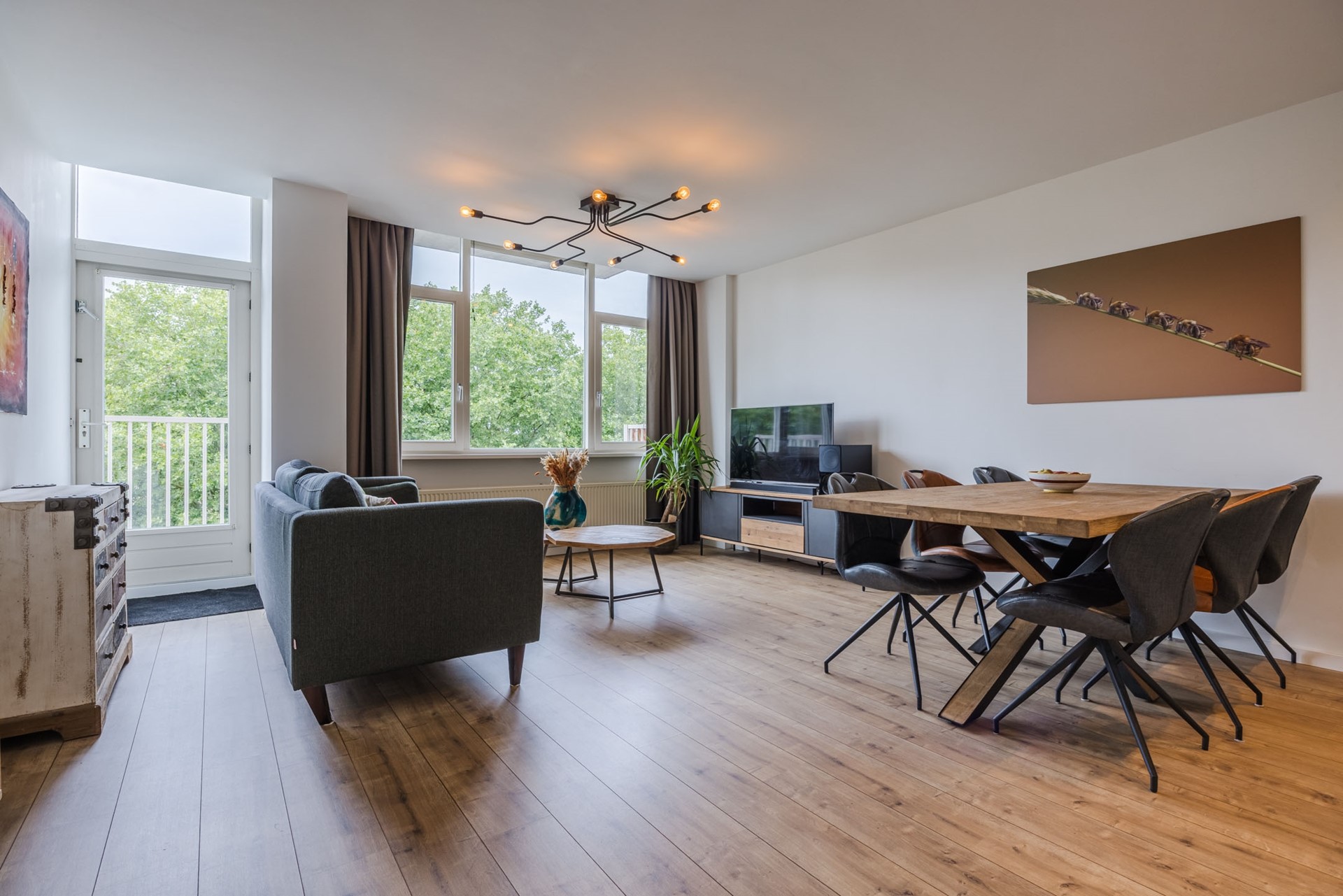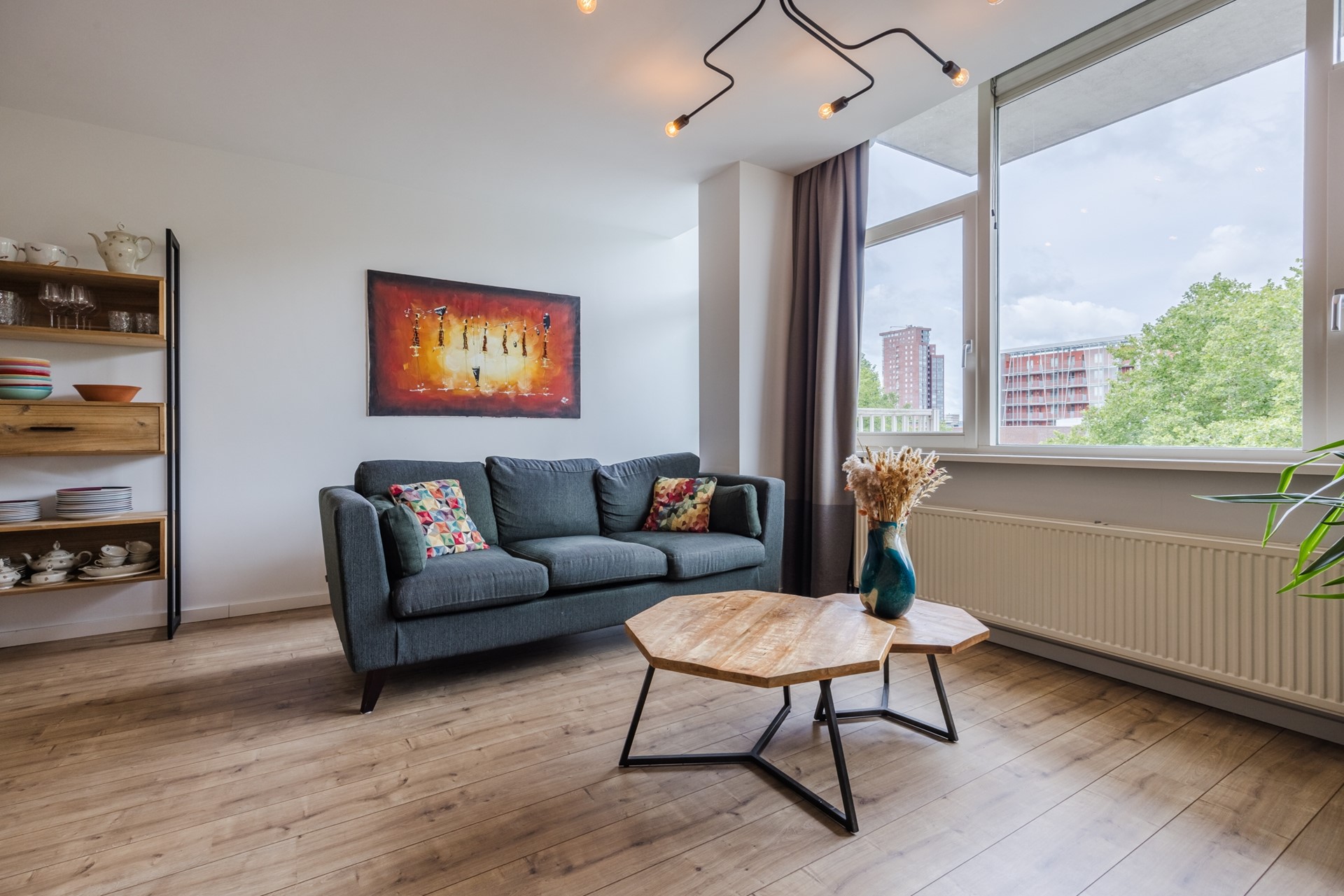 De ruime woonkamer (ca. 29 m2) is voorzien van een laminaatvloer en is gelegen aan de achterzijde van de woning met uitzicht over Rotterdam. Via de woonkamer heeft u toegang tot het balkon