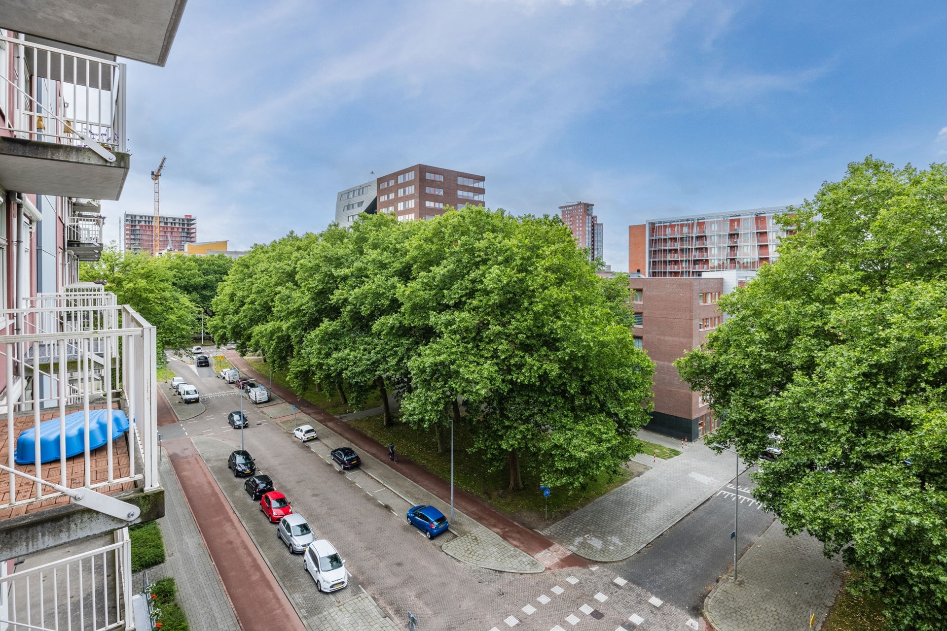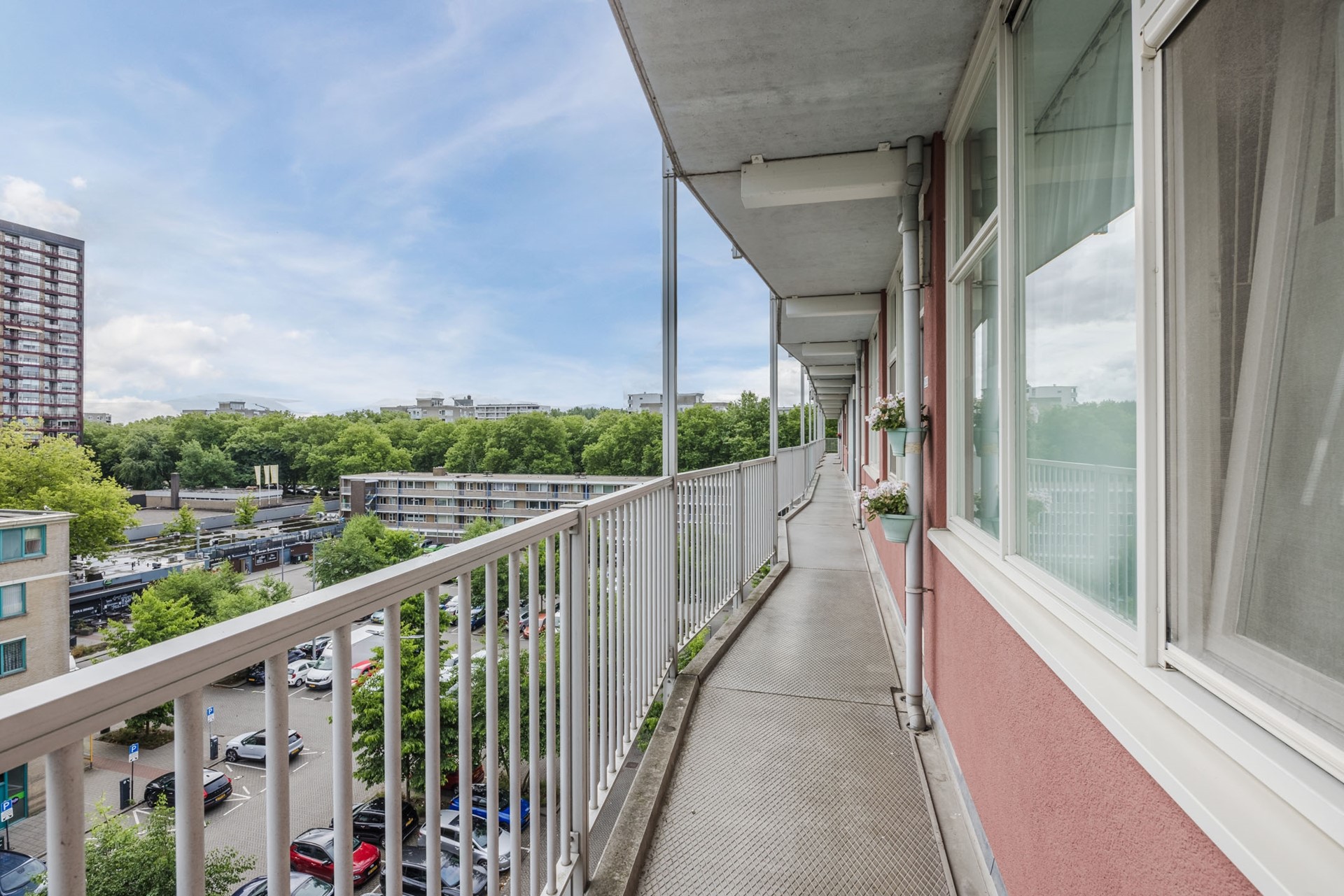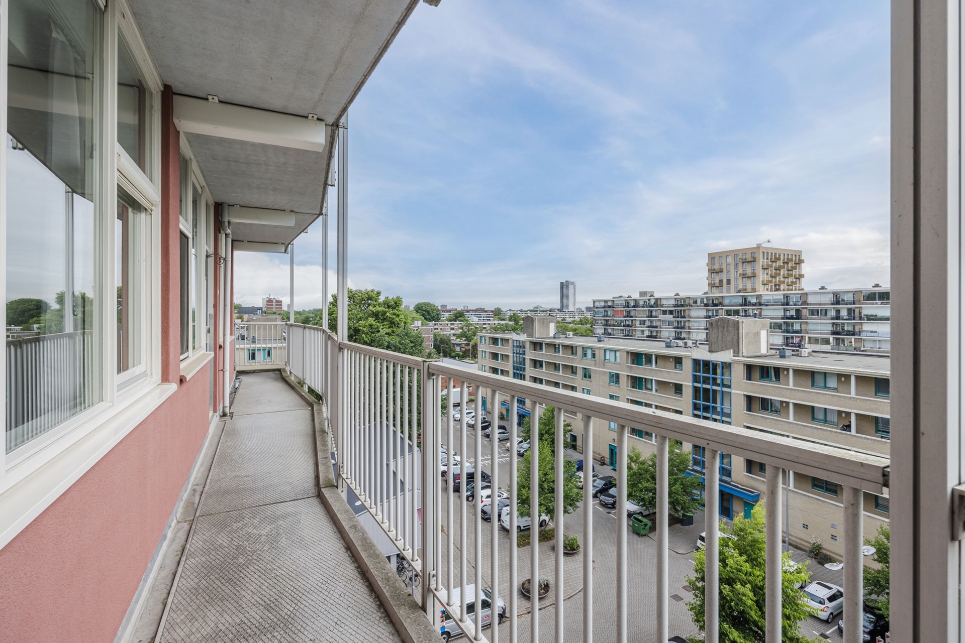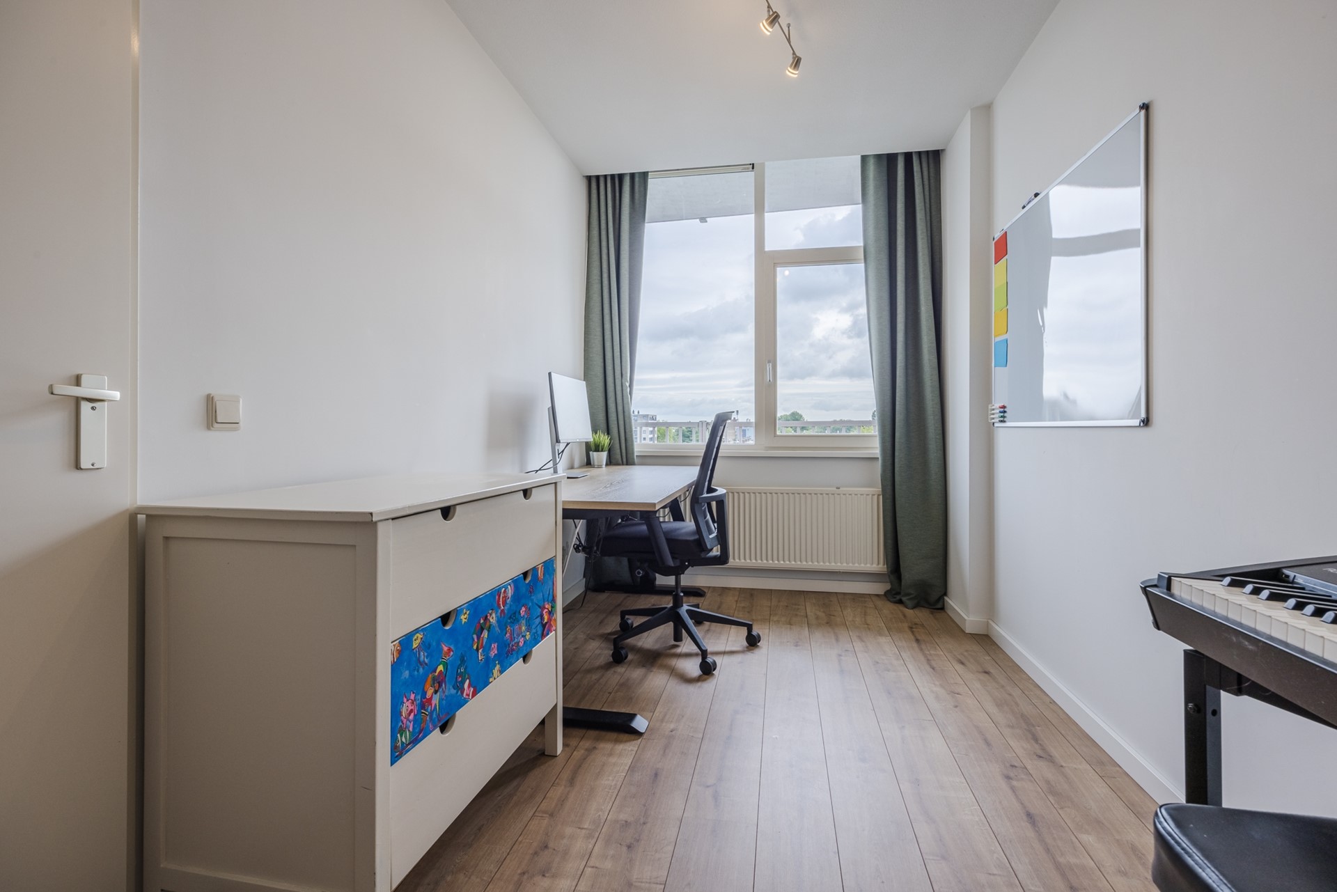 De ruime woonkamer (ca. 29 m2) is voorzien van een laminaatvloer en is gelegen aan de achterzijde van de woning met uitzicht over Rotterdam. Via de woonkamer heeft u toegang tot het balkon