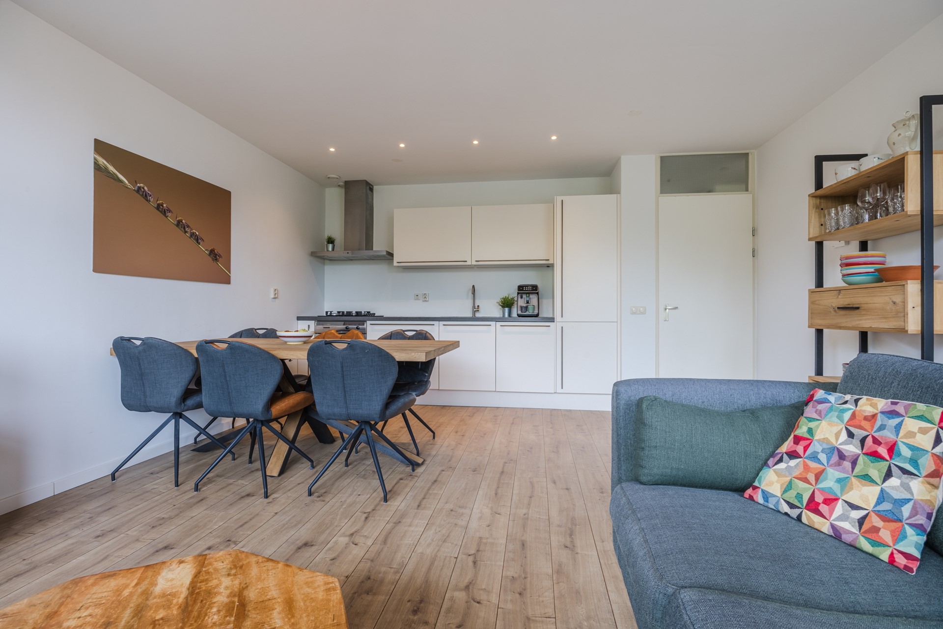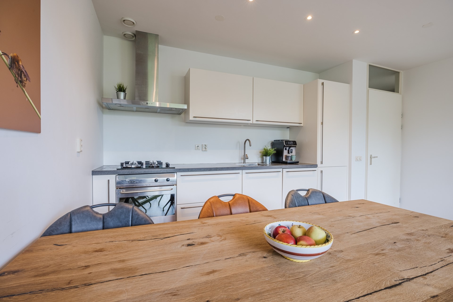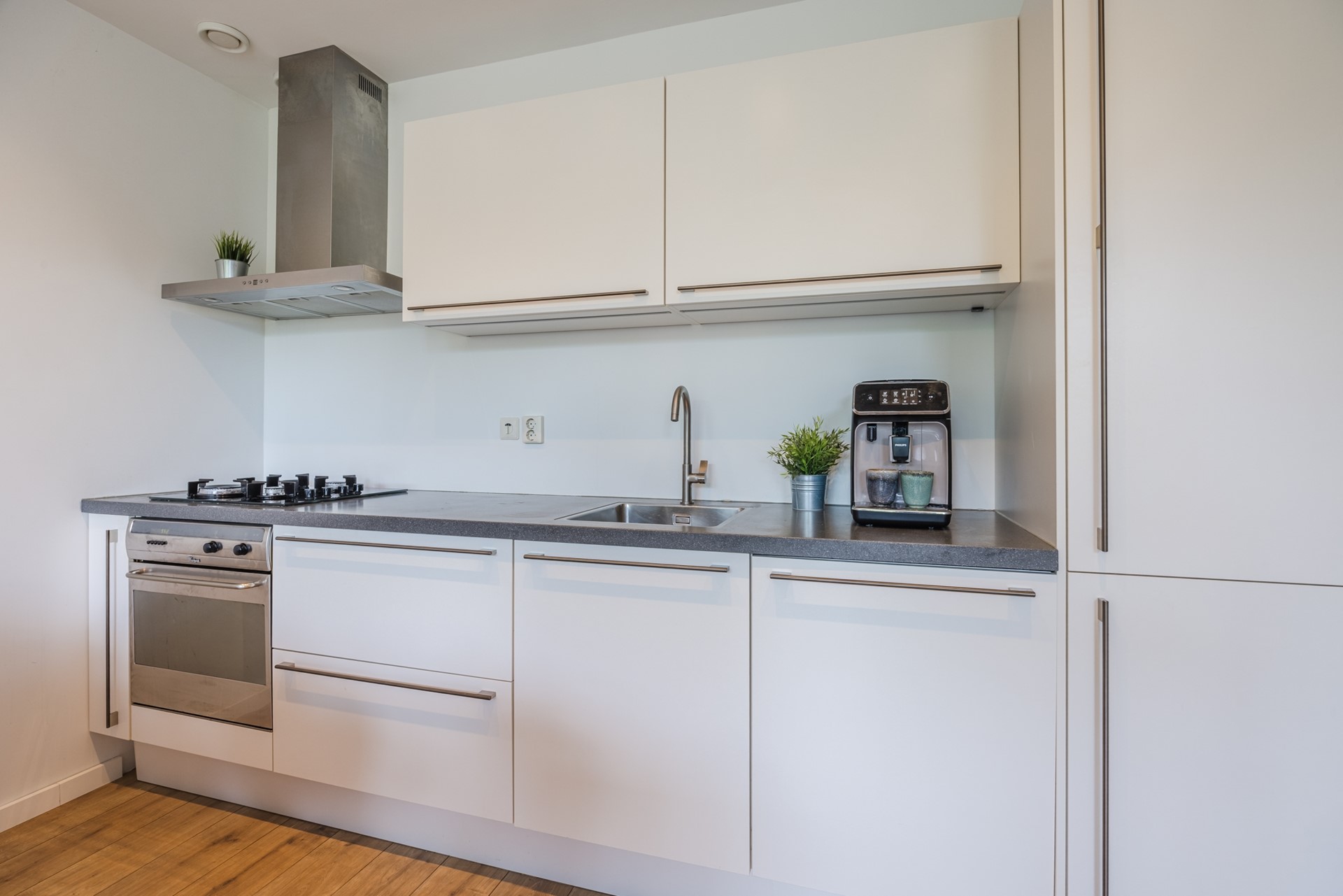(ca. 4 m2), gelegen op het westen. Het is mogelijk om de woonkamer groter te maken door de muur van de tweede slaapkamer te verwijderen. De open keuken (2018) is voorzien van een 4-pits gaskookplaat, oven, afzuigkap, vaatwasser, een koel/vriescombinatie en voldoende kast- en werkruimte.