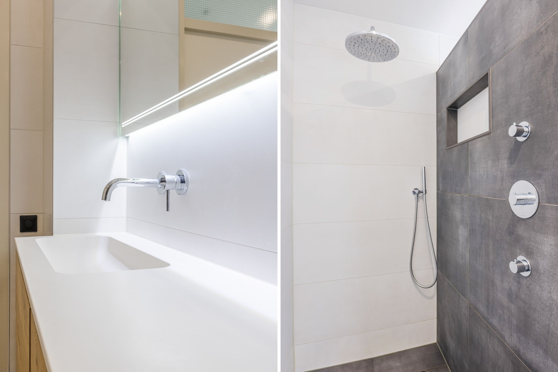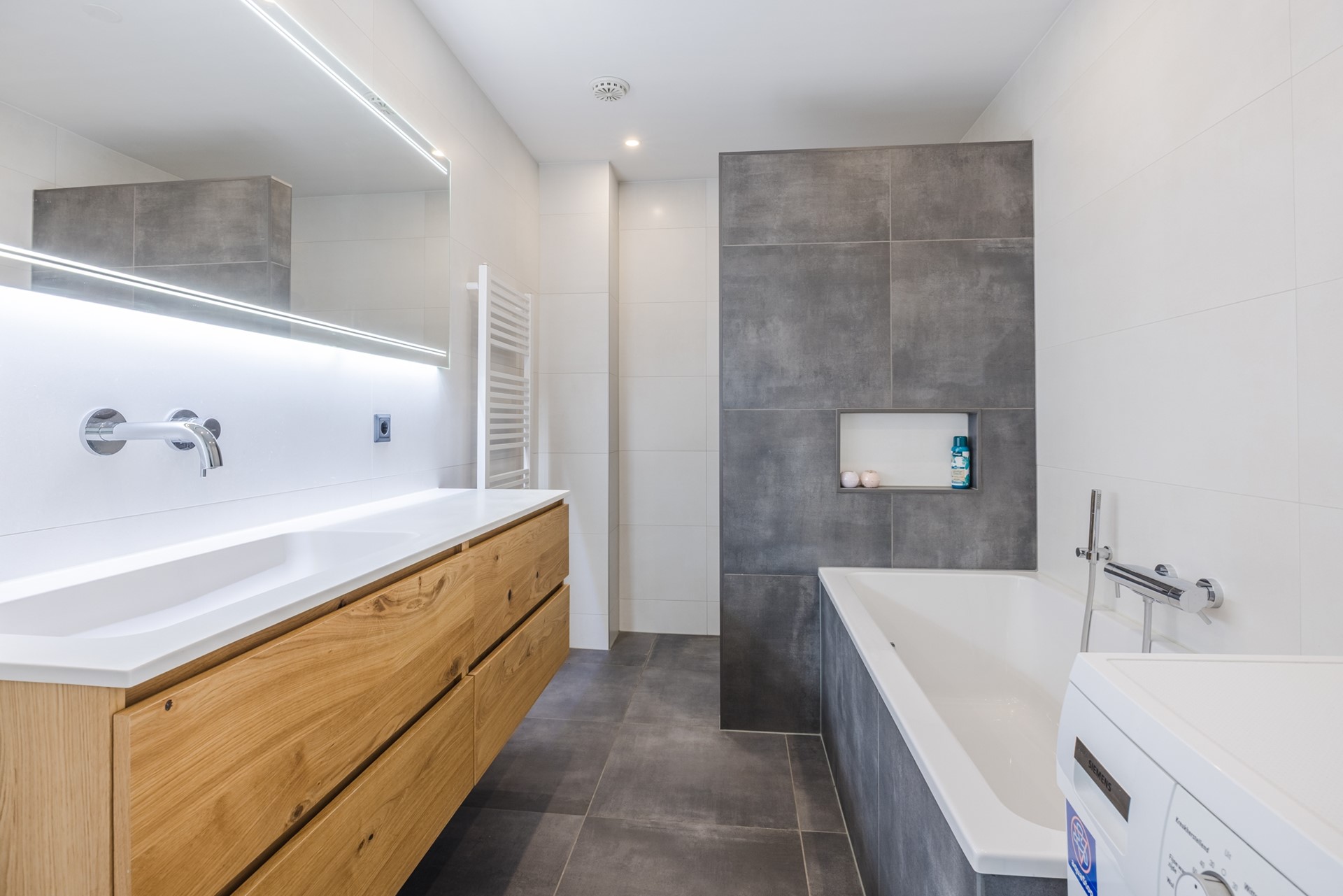 De moderne badkamer (2021) is voorzien van een inloop regendouche, bad, wastafel met meubel (160cm), spiegel met verlichting en verwarming, een aansluiting voor uw wasmachine en droger en een designradiator.