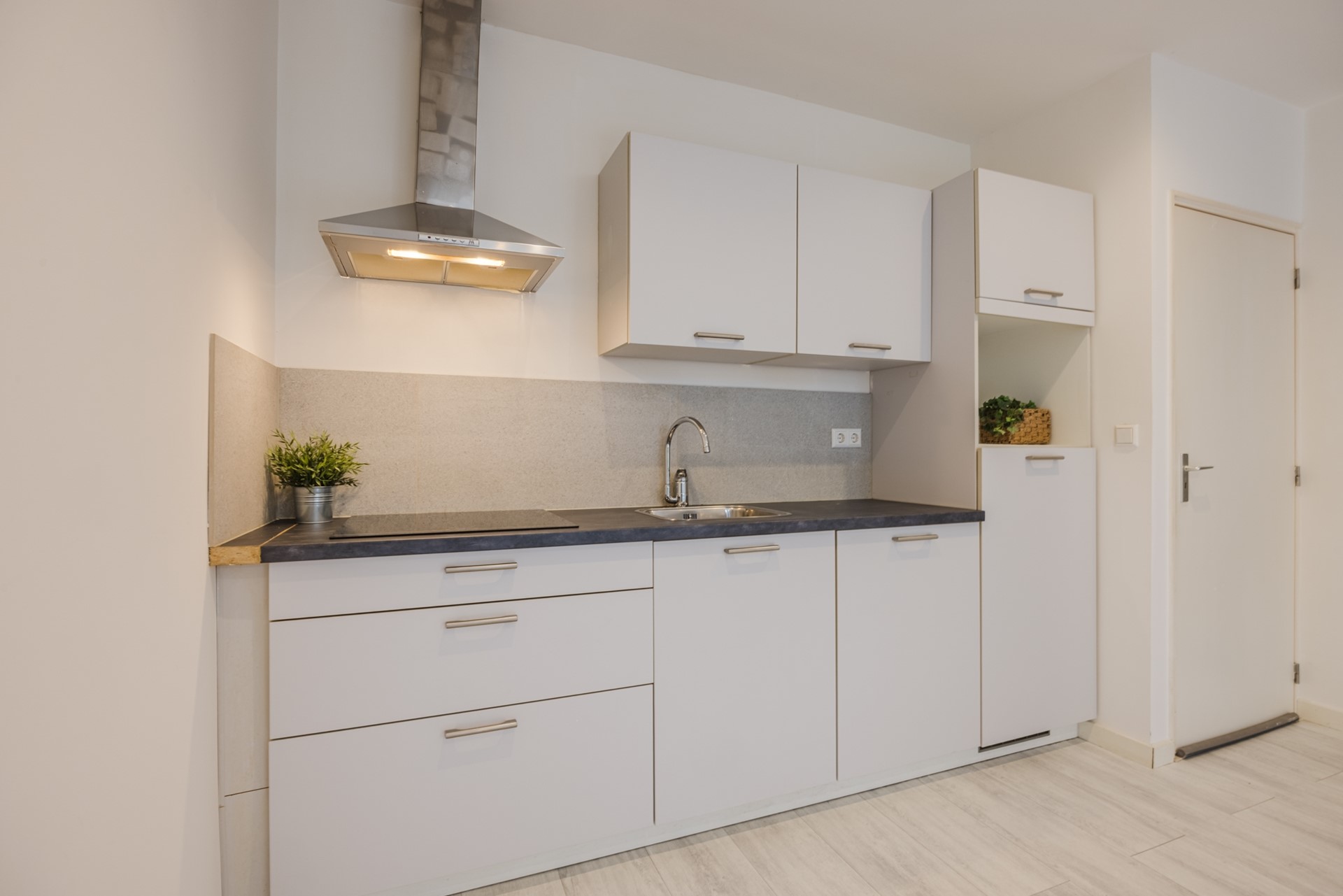 In het halletje heeft u de aansluiting voor de Cv-ketel en de wasmachine. De open keuken is voorzien van een 4-pits elektrische kookplaat, een afzuigkap, vaatwasser, een koelkast en voldoende werk- en kastruimte.
