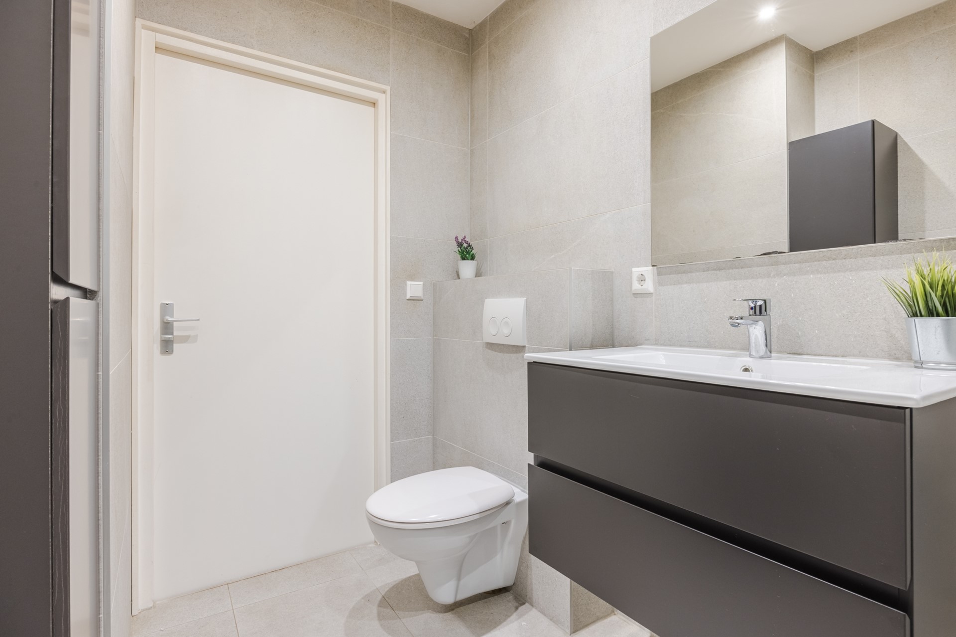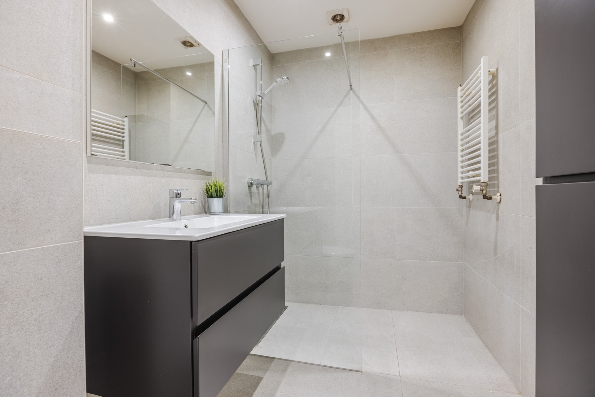 De moderne badkamer is geheel betegeld en voorzien van een inloop douche, wastafel, spiegel, disignradiator en het toilet. Verder beschikt het appartement over een meterkast en een vaste bergkast.