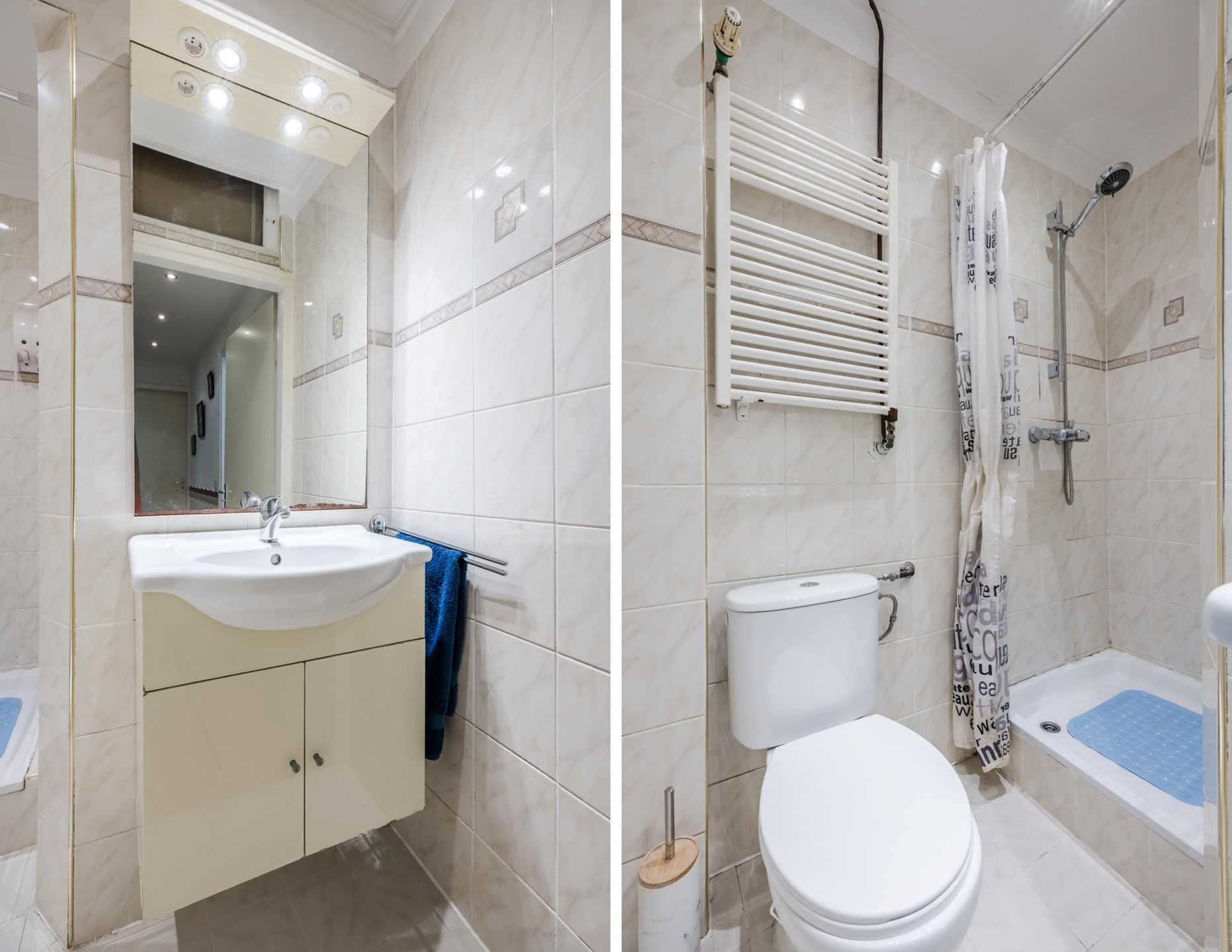 De badkamer is geheel betegeld en is voorzien van een douche, toilet en de wastafel.