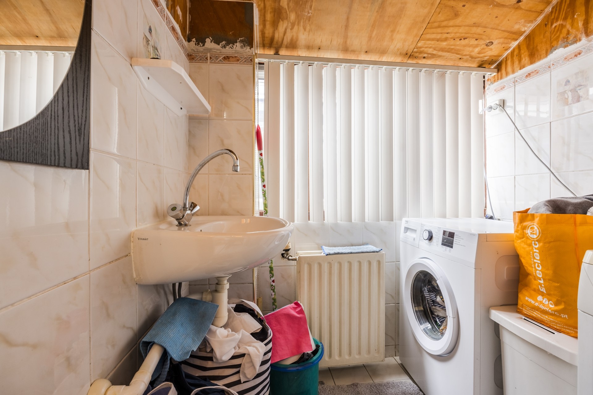 De wasruimte is gedeeltelijk betegeld en voorzien van een extra wastafel.