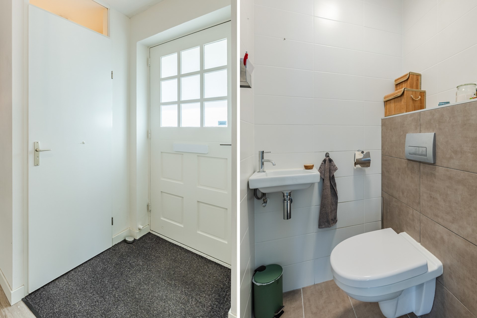 Verder vindt u nog de meterkast, trapkast voor extra opbergruimte en het toilet (2024). Deze toiletruimte is geheel betegeld en voorzien van een hangend closet en een fonteintje.