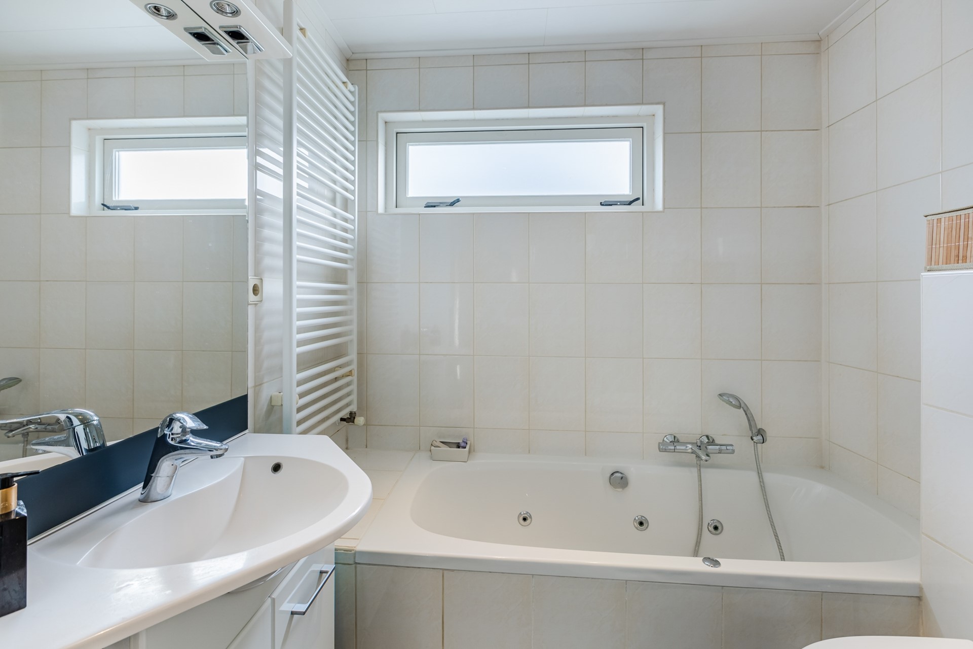 Op de overloop bevinden zich drie ruime slaapkamers, de badkamer en de trap naar de tweede verdieping. De badkamer is geheel betegeld en voorzien van een douche, ligbad, handdoek radiator, toilet, spiegel en een wastafelmeubel.